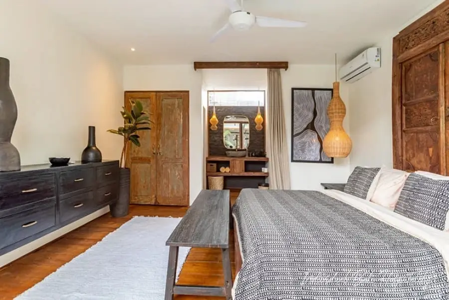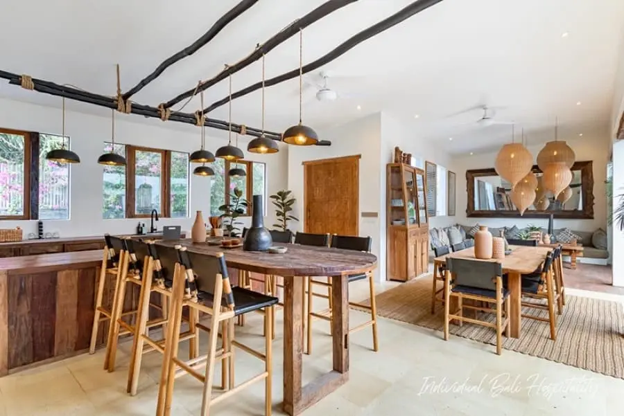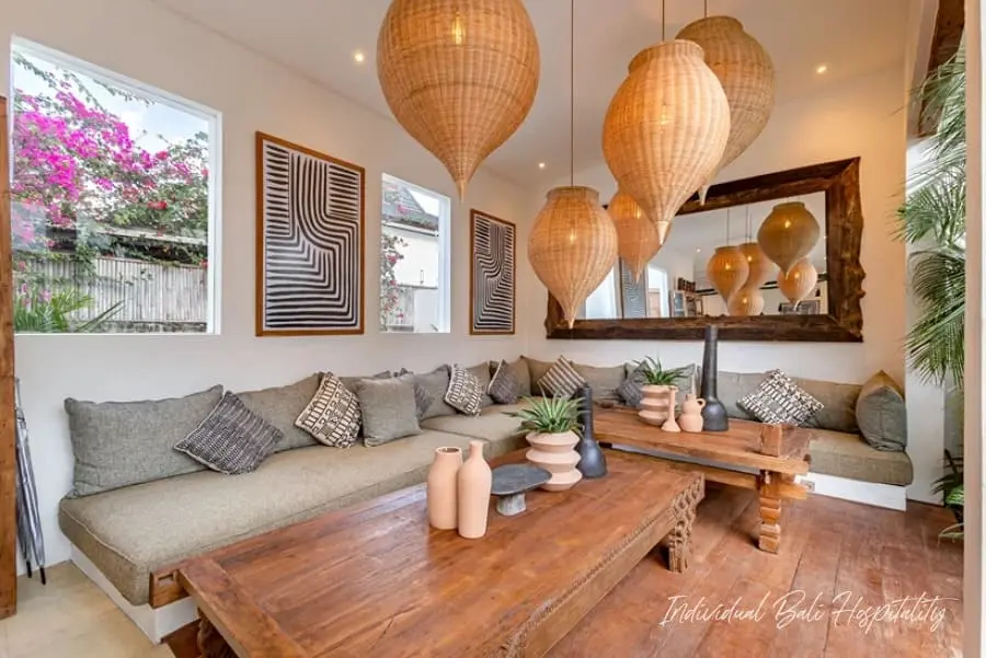 The villa’s spacious open-plan living area is designed with a seamless flow between indoor and outdoor spaces. With high ceilings, stylish décor, and cozy seating, the living room creates a warm and inviting atmosphere.