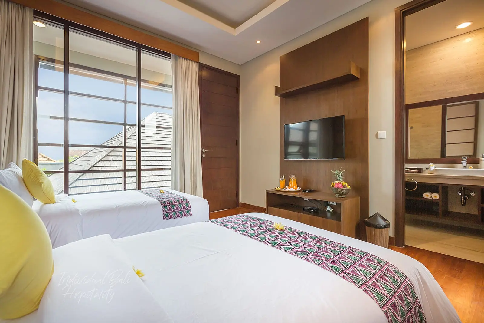 - Two separate twin villas: Each with three bedrooms, a private pool, and lush garden views.