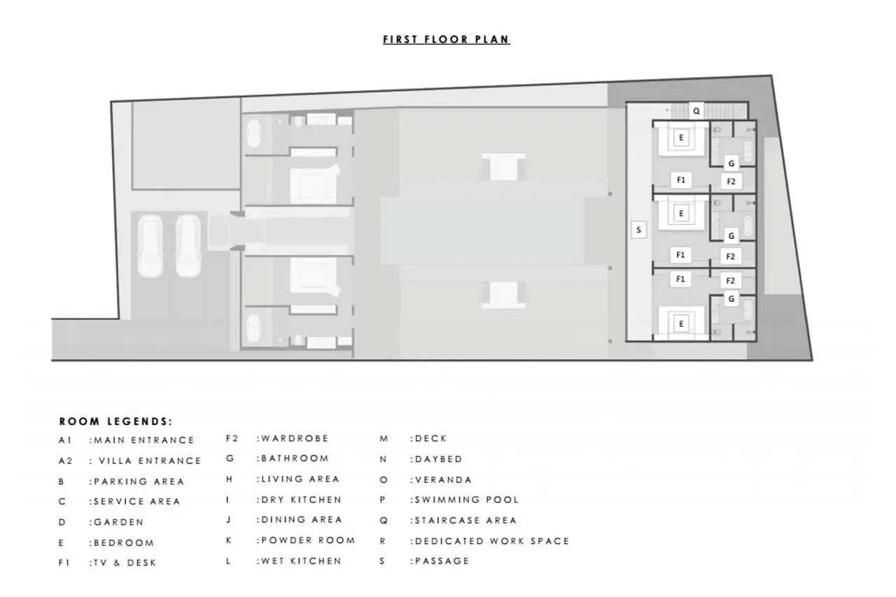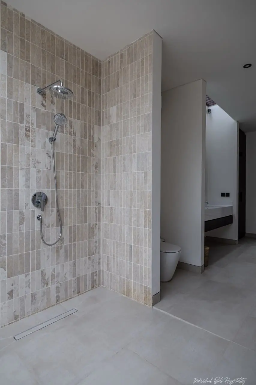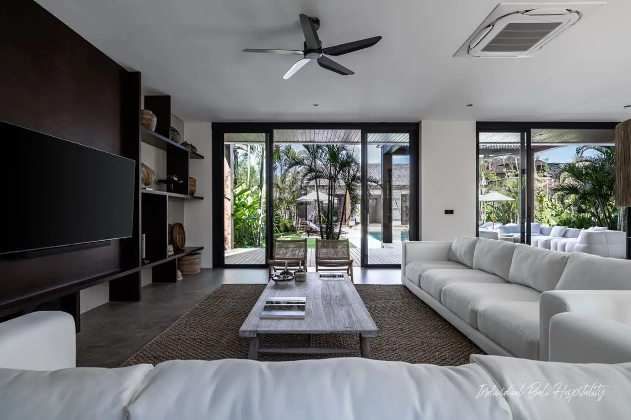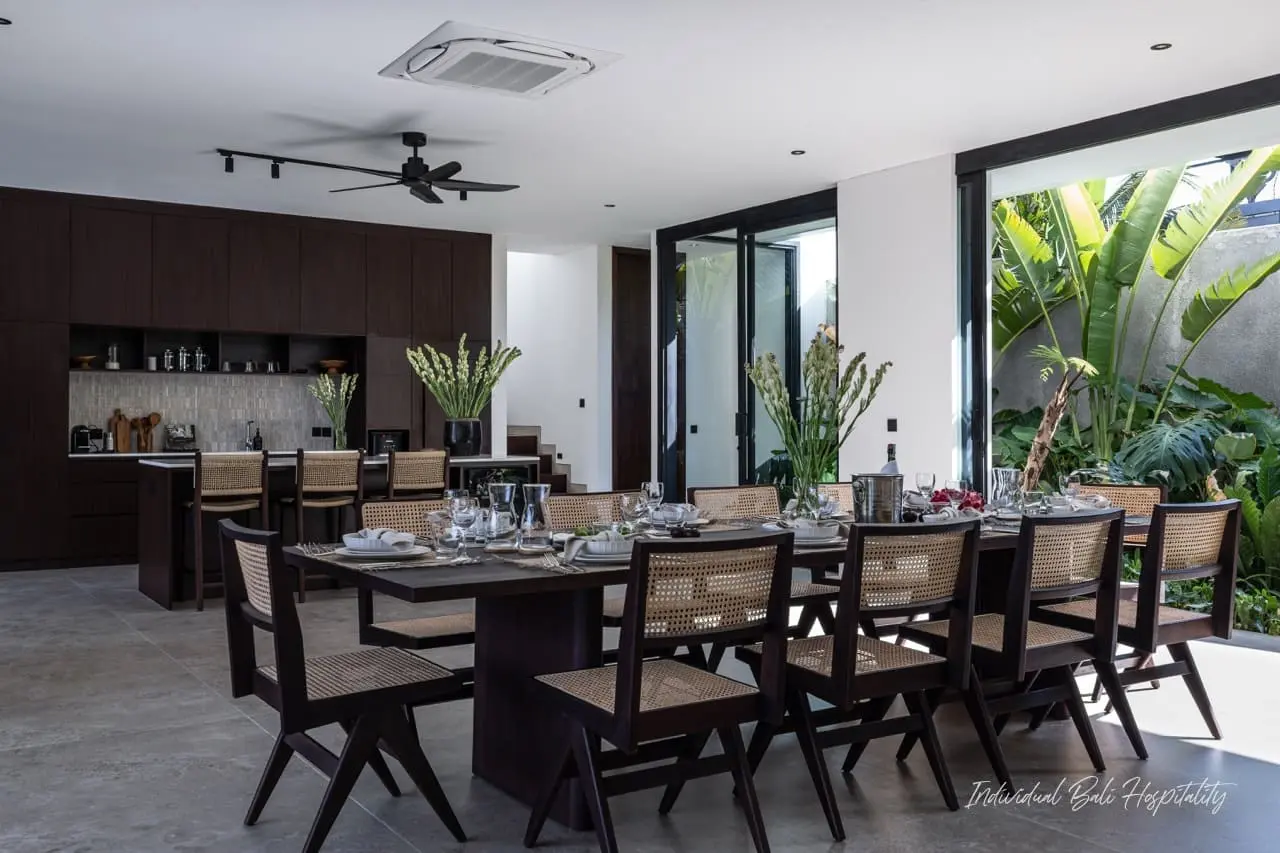 With five equally luxurious bedrooms, each featuring air conditioning, smart TVs, and terrazzo bathtubs, every guest can enjoy the same level of comfort. The enclosed living and dining room provide a stylish yet cozy space for gatherings, while the 15-meter private pool creates a tranquil spot to relax under the Bali sun.