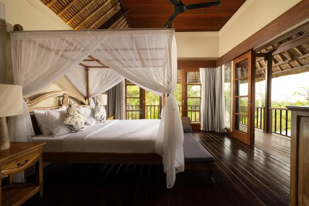Villa Grasshopper offers three opulent bedrooms, making it the ideal vacation house for ultimate comfort and relaxation. The master bedroom, located on the second floor, overlooks the pool, lush greenery of the hill, and offers a partial ocean view. It is furnished with a king-sized bed. The remaining two bedrooms are equipped with a king-sized bed and a single bed, each featuring a canopied bed.