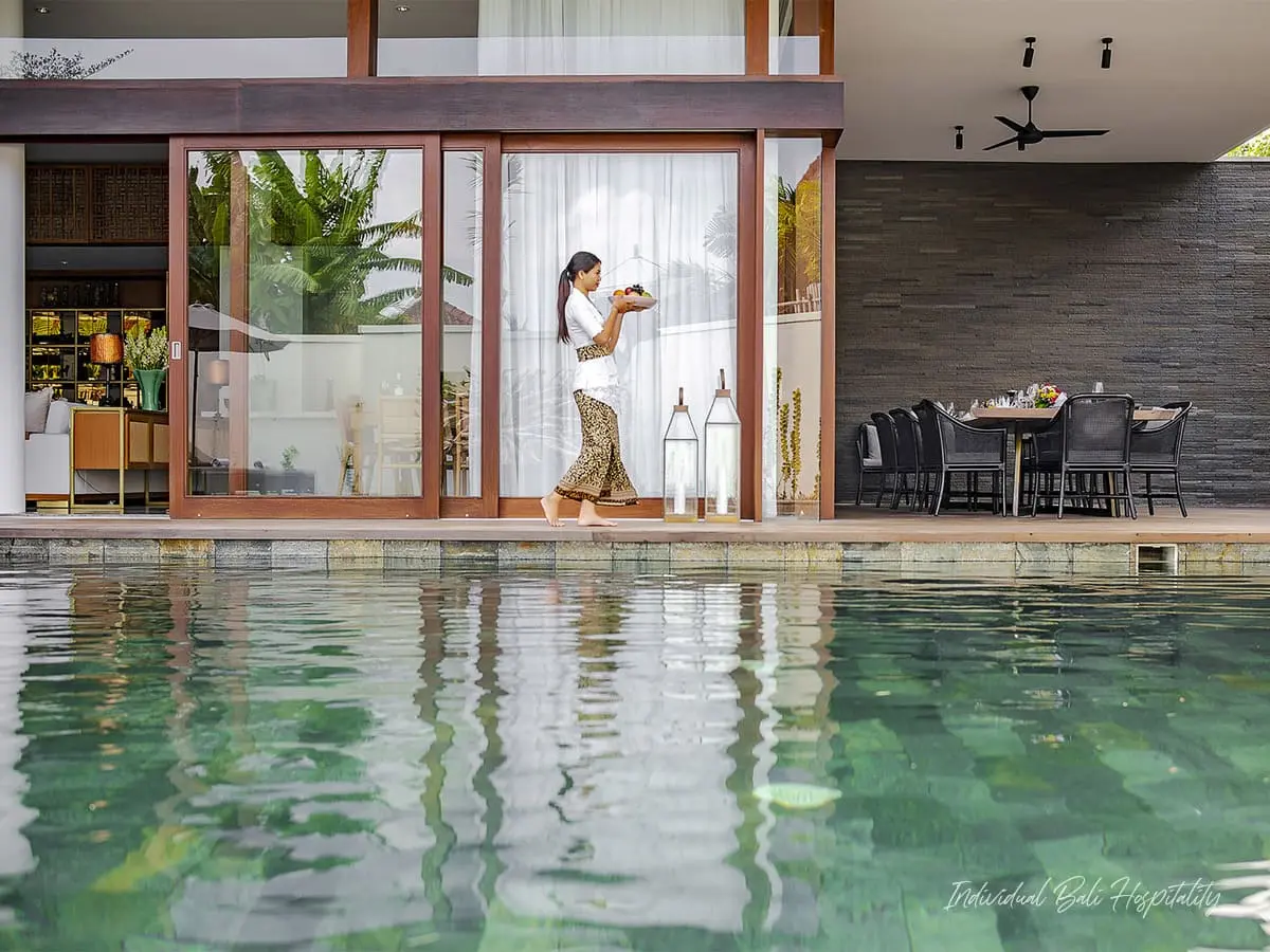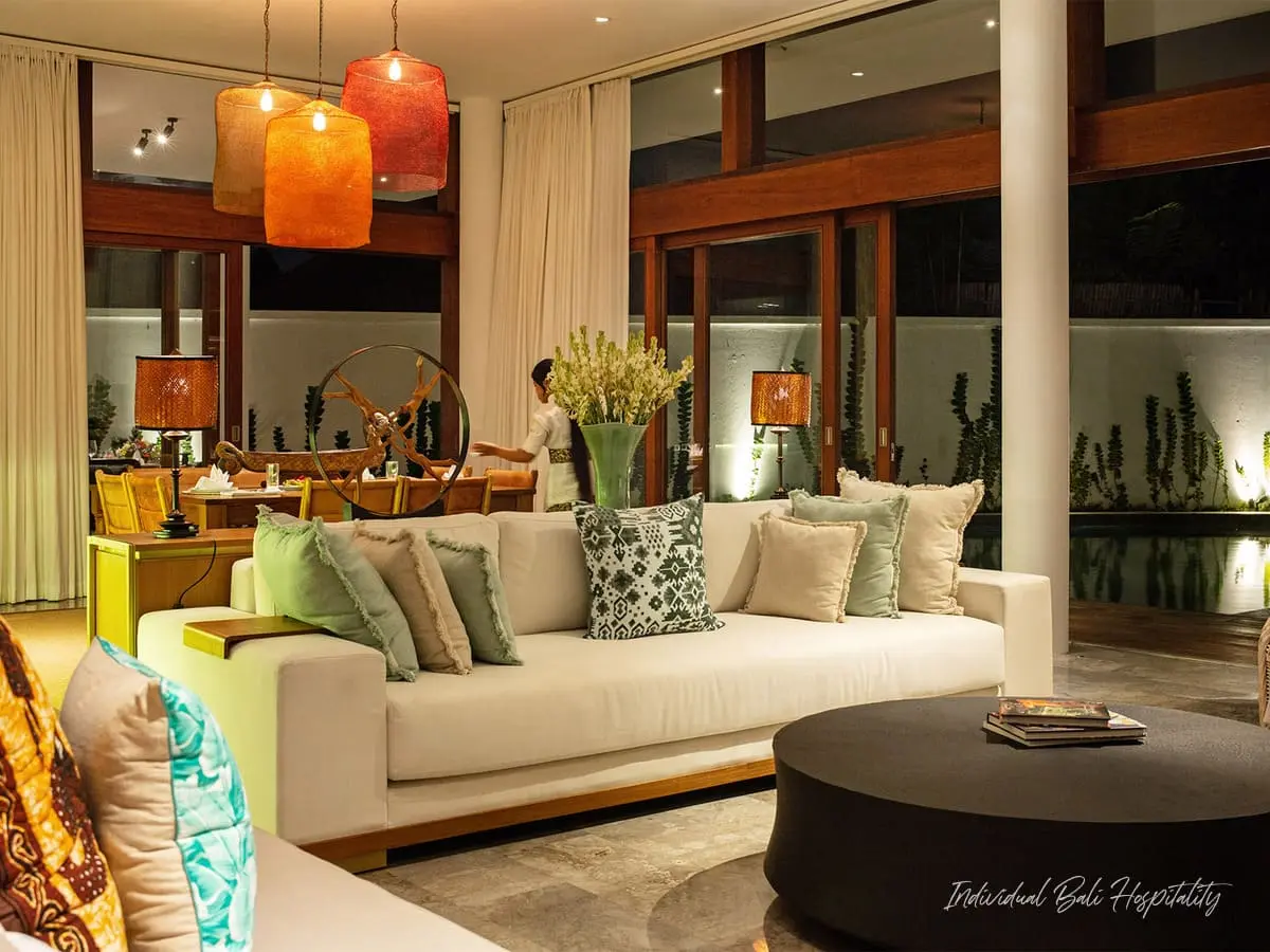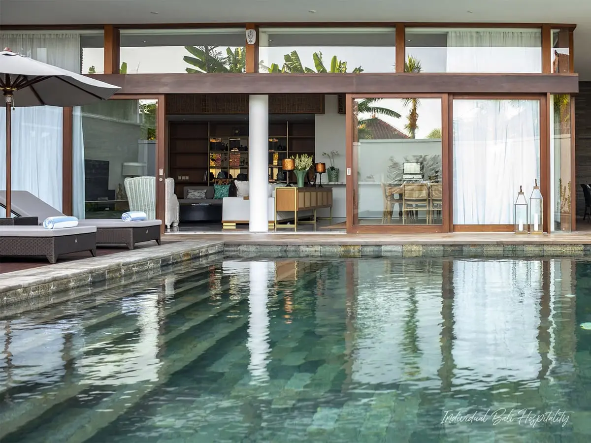 Villa Indrani is a sophisticated five-bedroom retreat nestled in Canggu, designed for families or groups seeking privacy, elegance, and effortless access to Bali’s vibrant beach lifestyle. Tucked away at the end of a quiet lane, this villa is just a few minutes’ walk from Berawa Beach — renowned for its surfing waves, breathtaking sunsets, and laid-back coastal charm.