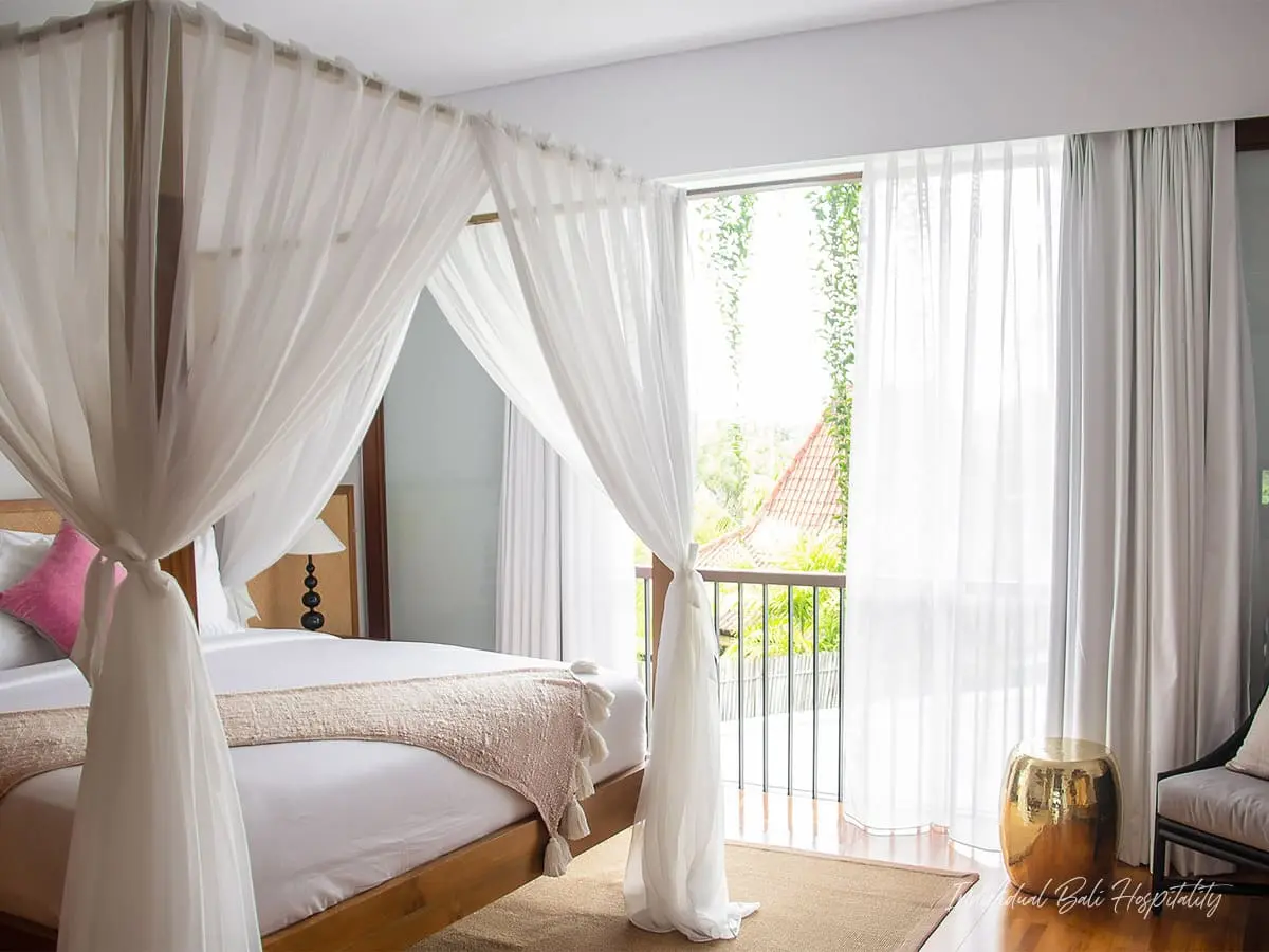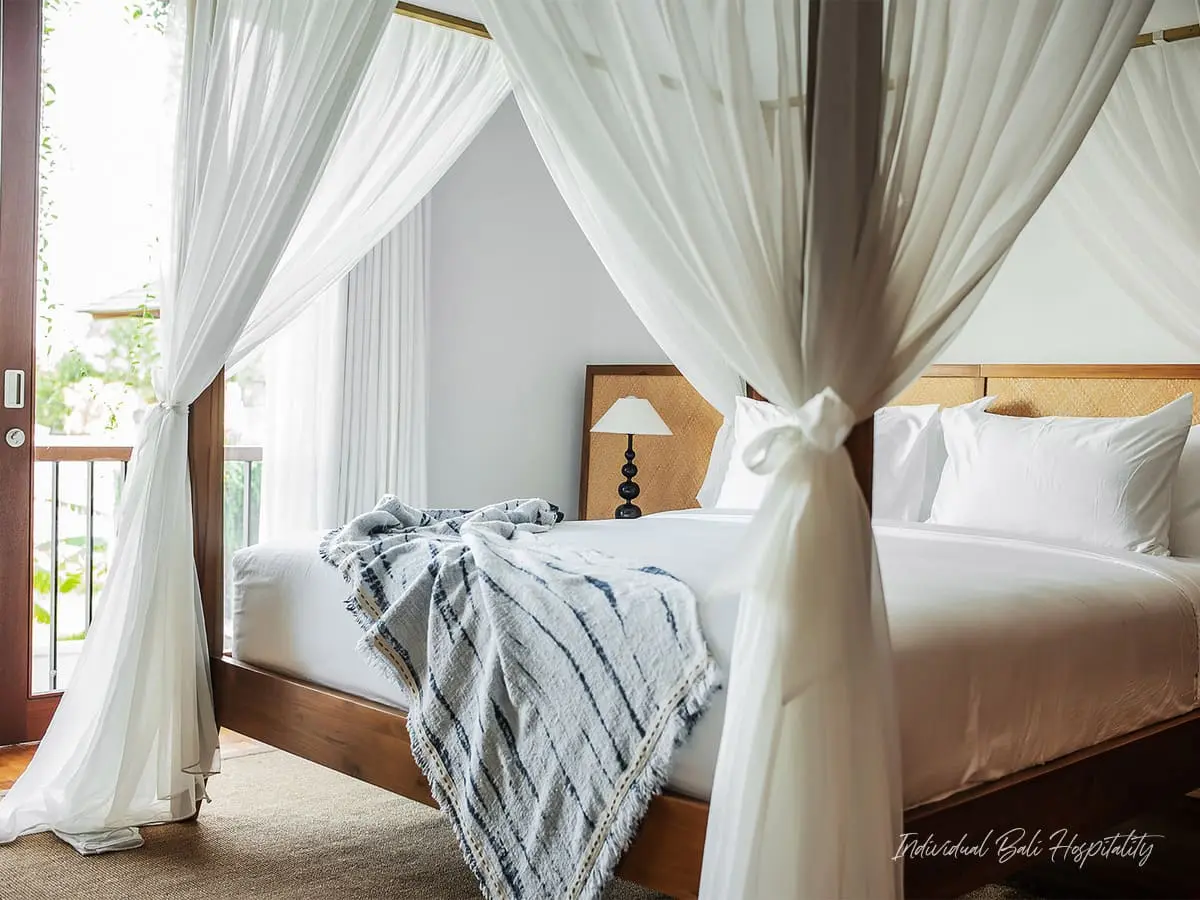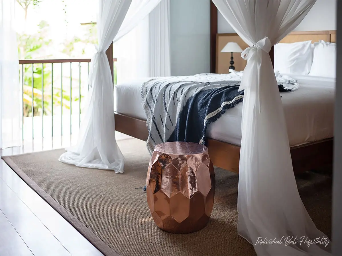 Three additional guest bedrooms occupy the mezzanine floor, each outfitted with king-size four-poster beds, ensuite bathrooms, and large floor-to-ceiling windows framing serene views of the courtyard and greenery. The villa spans three levels, with a grand entrance on the upper floor and a spiral staircase leading to the rooftop terrace.