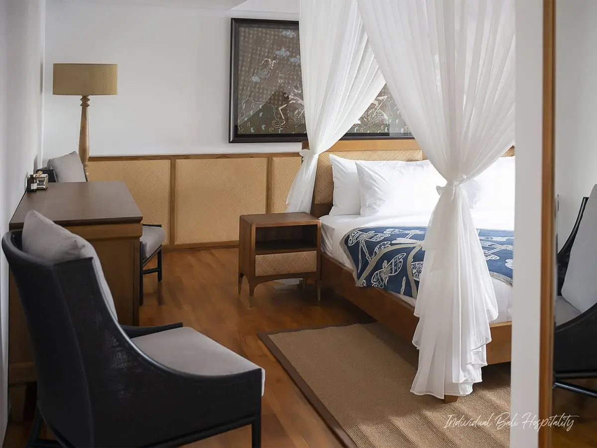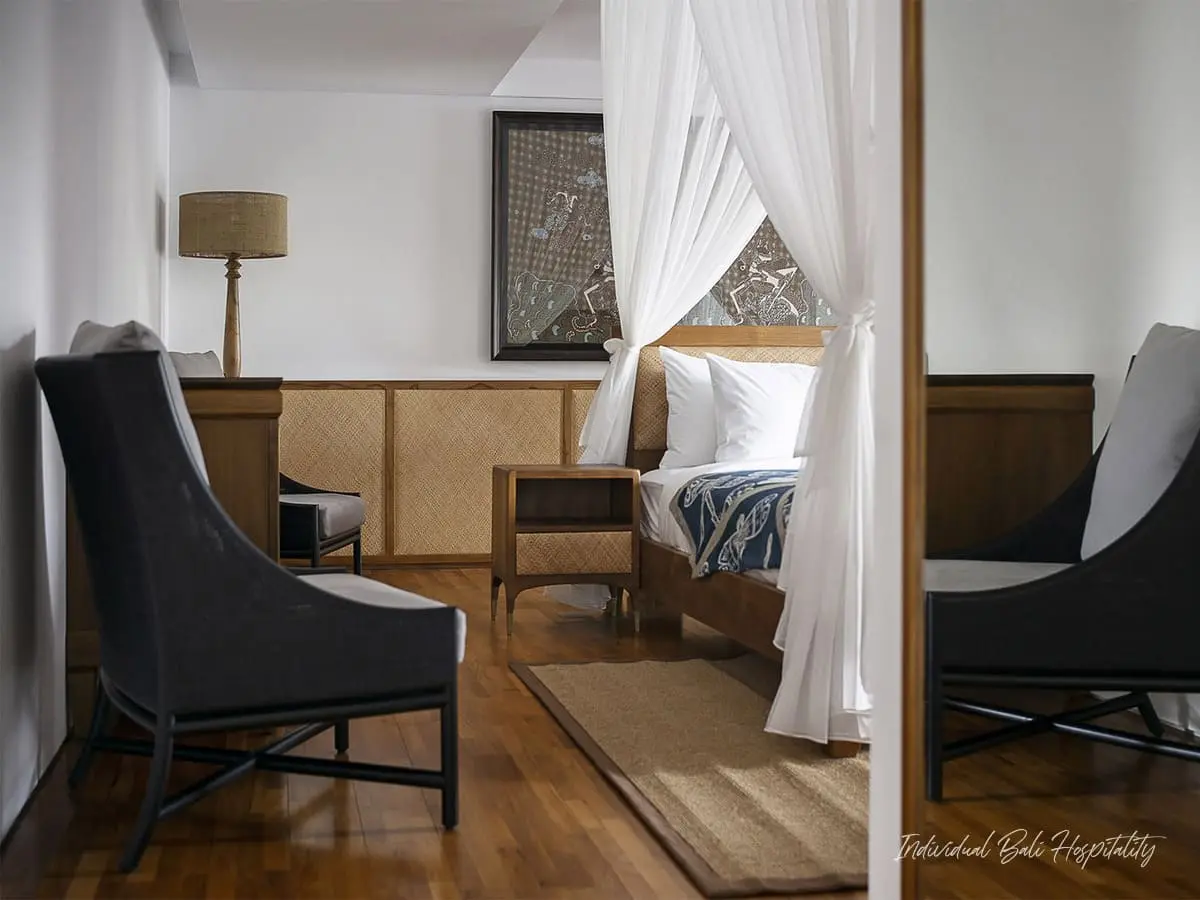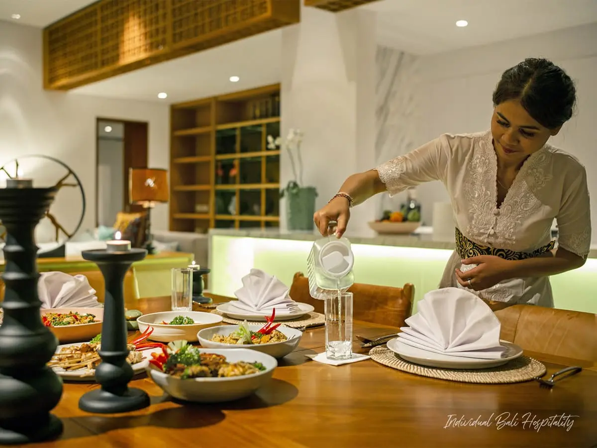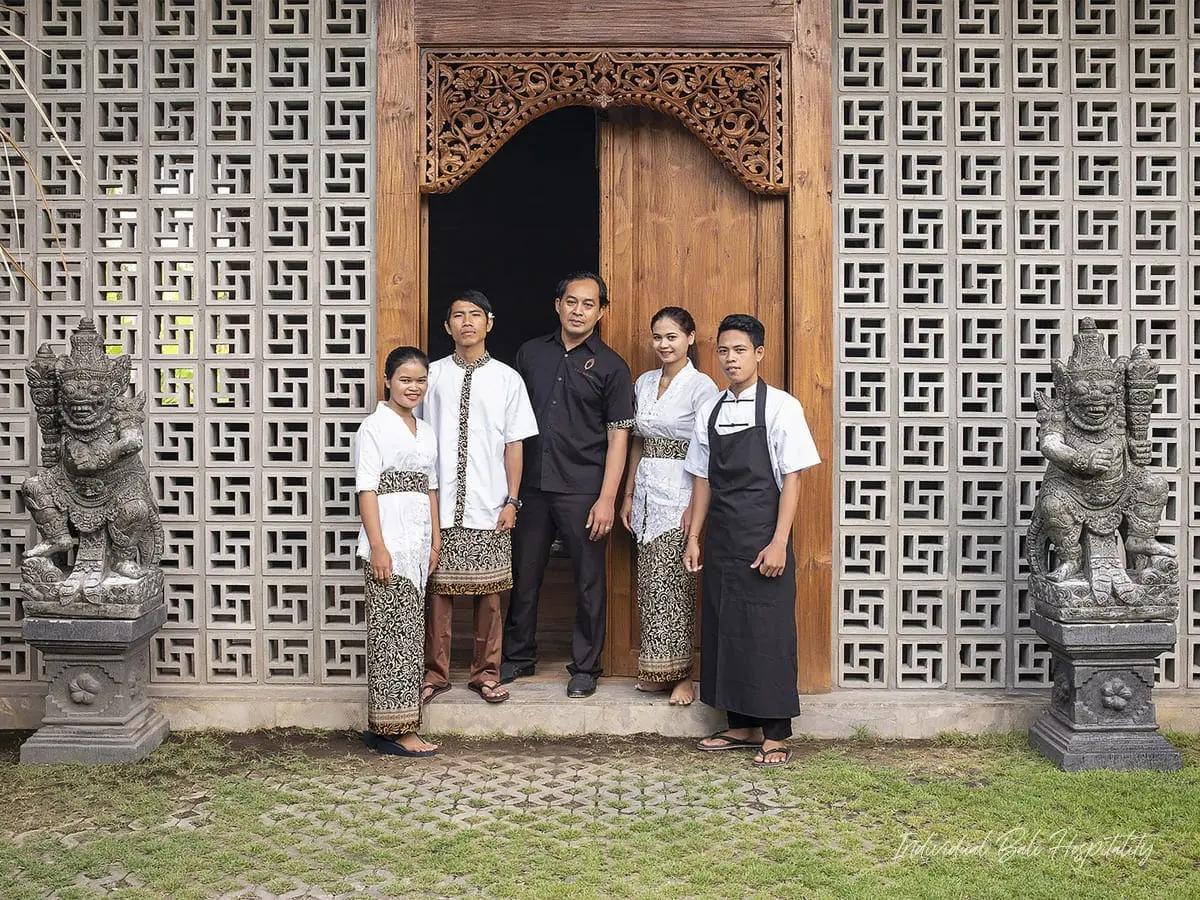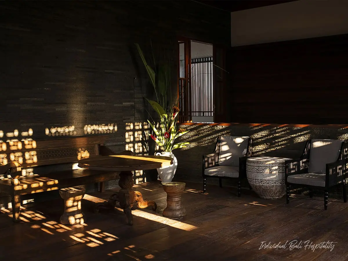 Outside, the courtyard pool area invites relaxation with six sun loungers and a fan-cooled dining table for ten — perfect for brunches, lazy afternoons, or intimate dinners by the pool. Traditional Balinese touches include a dramatic tree root sculpture and a small garden shrine where daily offerings are made by villa staff, inviting guests to experience authentic local culture.