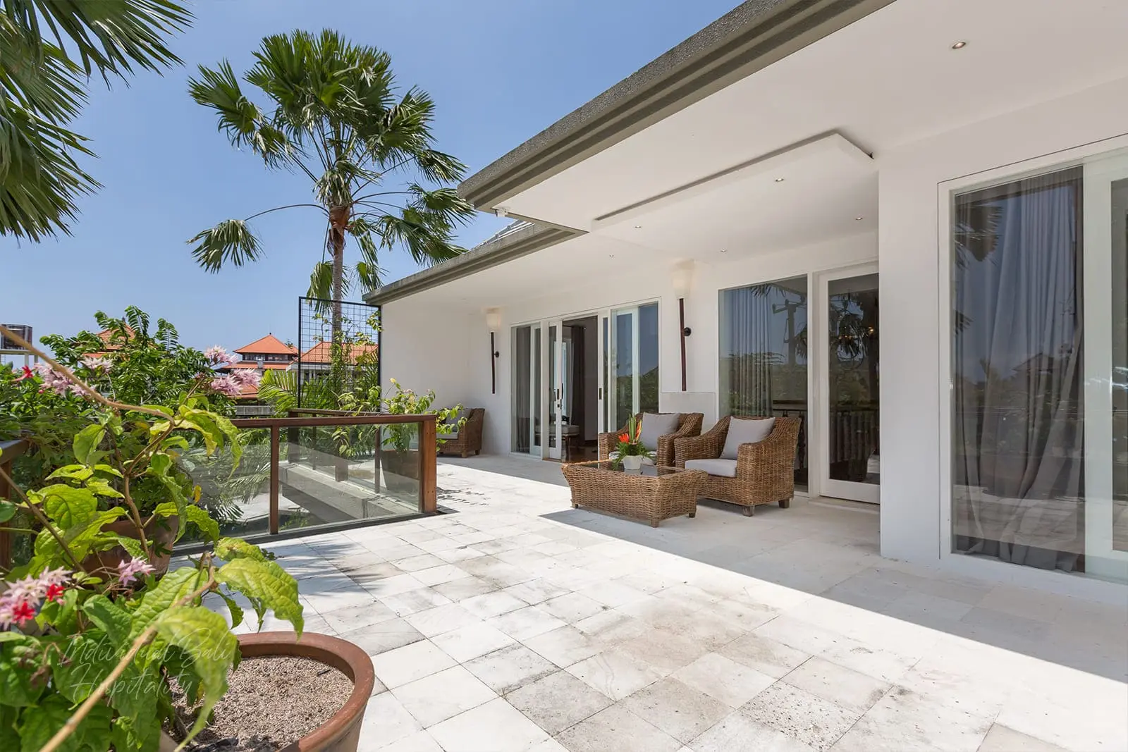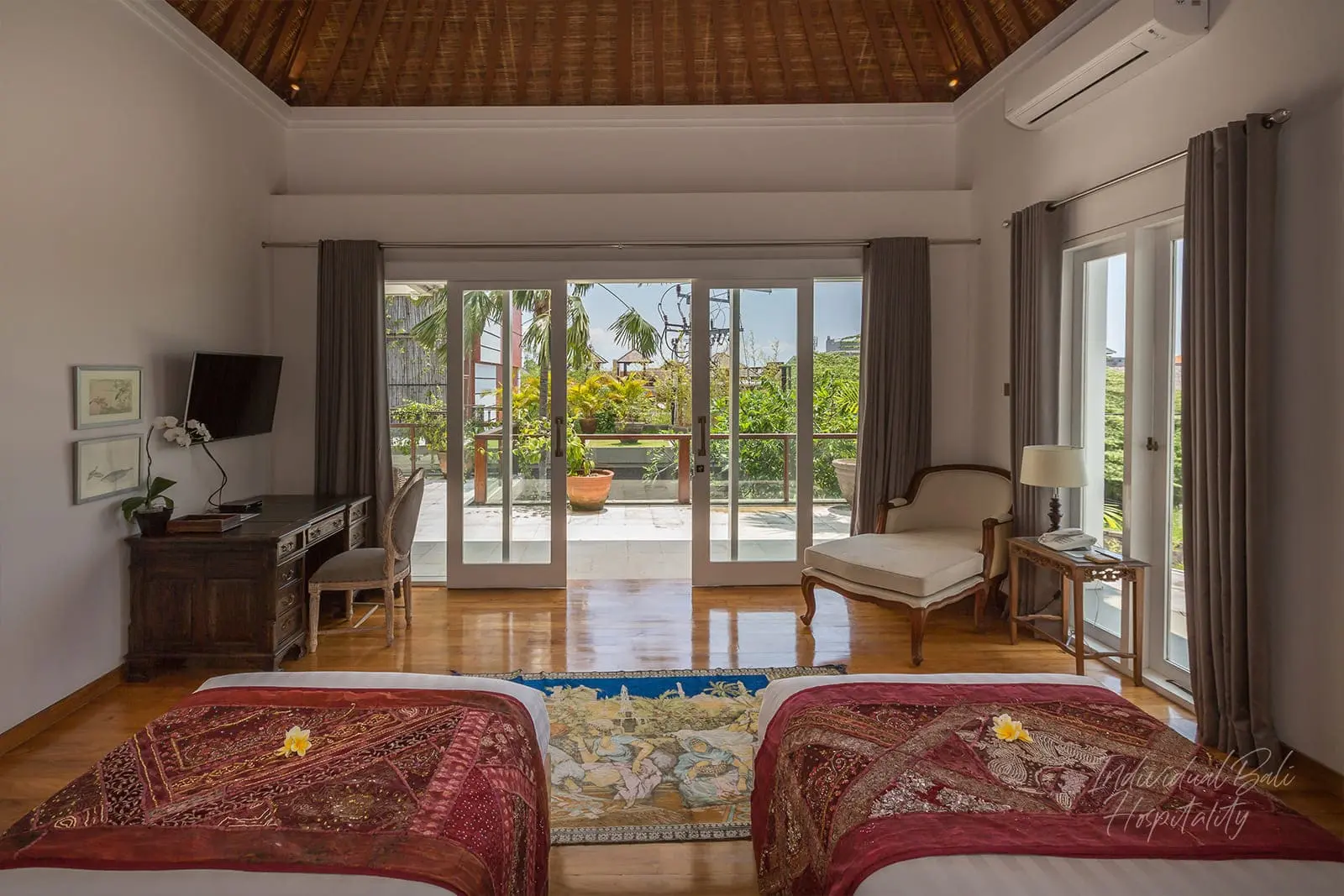 The main building of Villa Jadine features three air-conditioned bedrooms, one on the first floor and two on the second floor. Each room of Villa Jadine is generously proportioned, bright, and equipped with modern amenities, including TVs with international channels. Two of the bedrooms boast king-size beds, while the third offers twin beds. The upper-level rooms feature stunning balconies with views of the rice fields and the pool, perfect for enjoying a massage upon request. Each room also includes a bathroom with showers and wooden bathtubs.