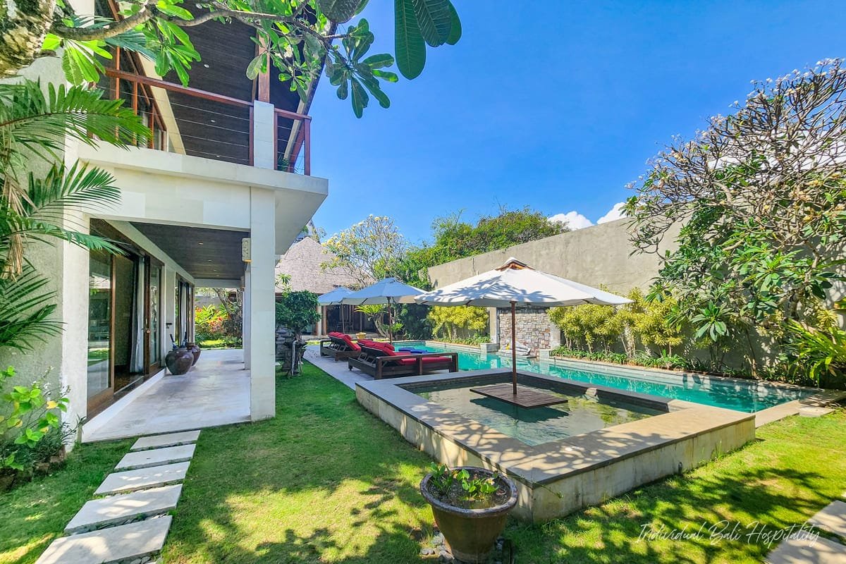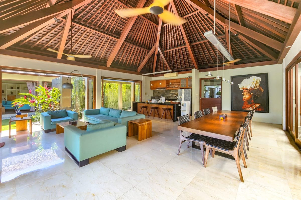 Nestled just 100 meters from the pristine Batubelig beach in Seminyak, this contemporary villa features a spacious living and dining area, a four-bedroom pavilion, an entertainment room, and a business center. The villa’s open-air ‘bale’ is set amidst tropical gardens, boasting a 16-meter swimming pool and an outdoor Jacuzzi. The walled garden and elegant interiors offer ample space and natural light, providing guests with a variety of areas to relax and entertain.
