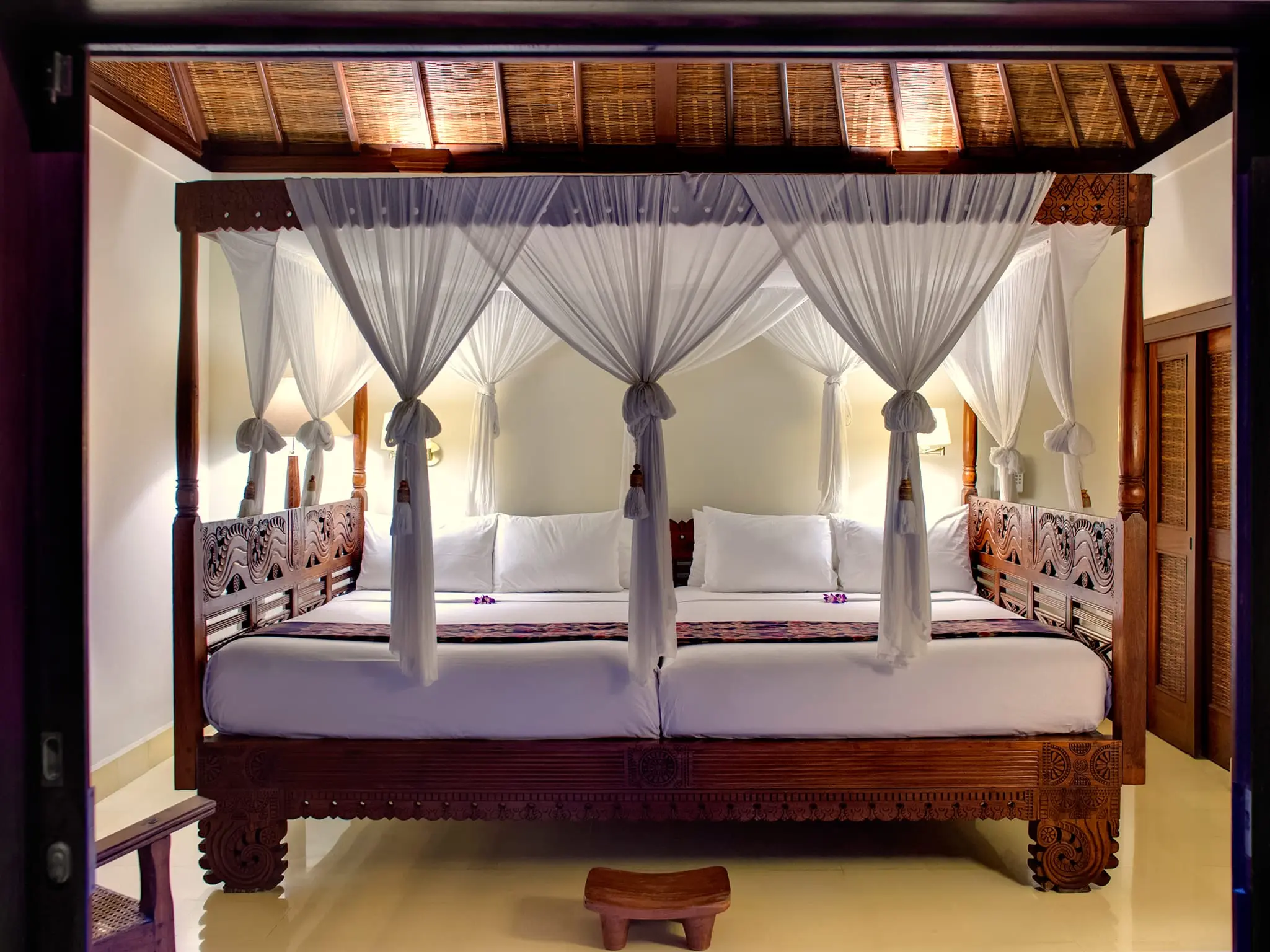 Comfortable Accommodations: The main two-storey pavilion houses the master suite, one guest bedroom, the living area, and the kitchen. Adjacent to this is the dining balé, while the other two guest bedrooms lie side by side below a charming thatched roof. Each air-conditioned bedroom features polished cream terrazzo floors, ceiling fans, and beautifully carved wooden beds draped with mosquito nets. Tastefully decorated with Javanese antiques and traditional paintings, the rooms offer a homely and comfortable retreat. iPod docks and TV/DVD players add modern convenience, while the garden bathrooms with open-air showers exude tropical luxury.