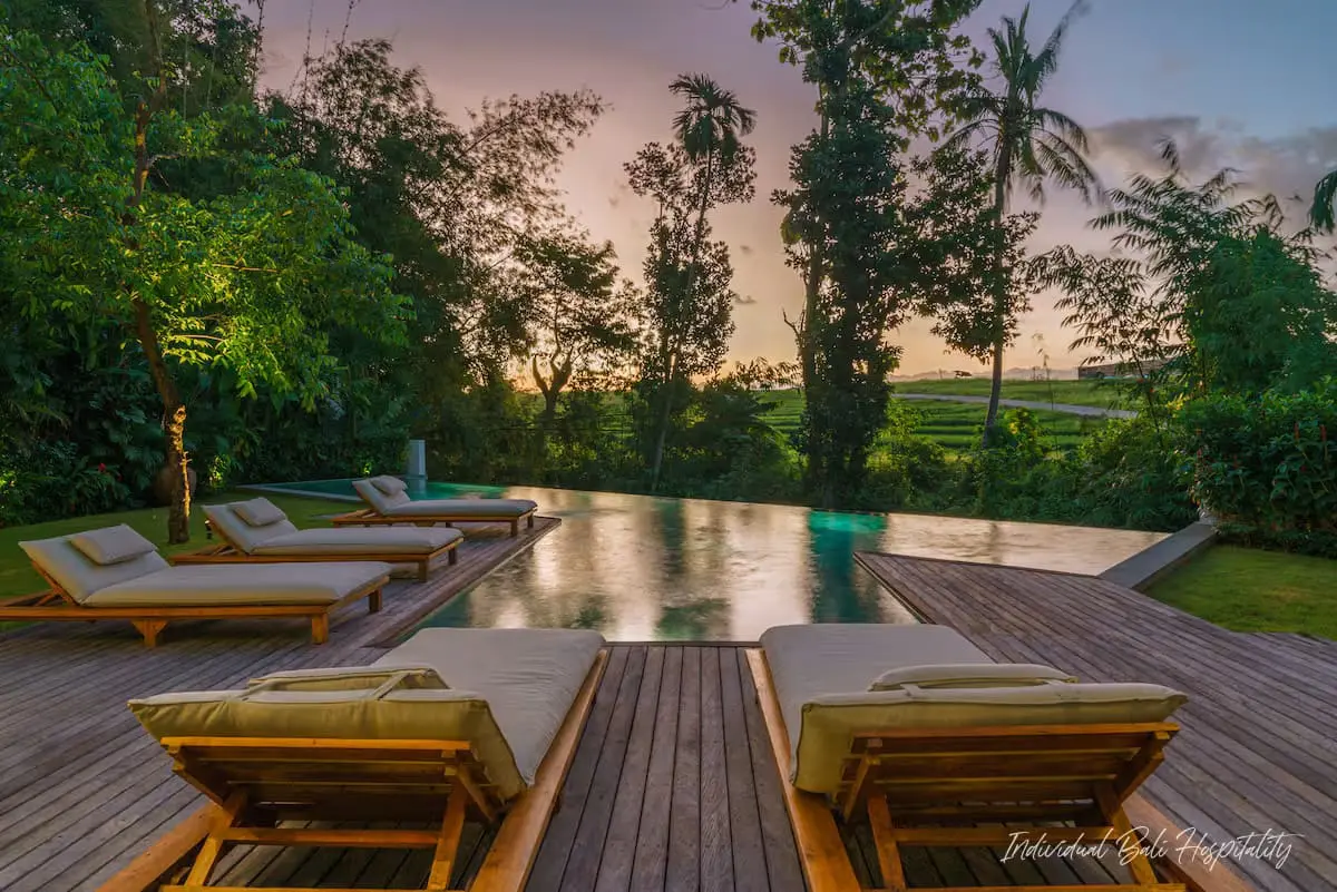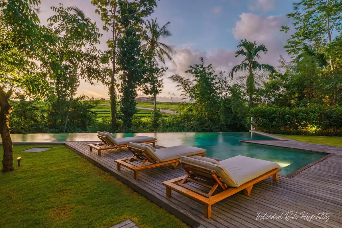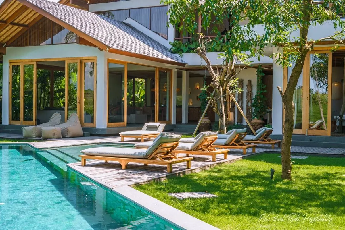 The property features five thoughtfully designed en-suite bedrooms, a large swimming pool facing lush rice fields, and an open living area perfect for relaxing or entertaining. The fully equipped kitchen gives guests the freedom to prepare meals or request in-villa dining services through our concierge.