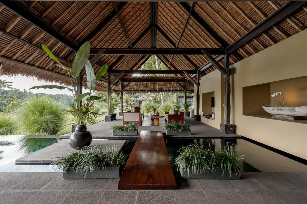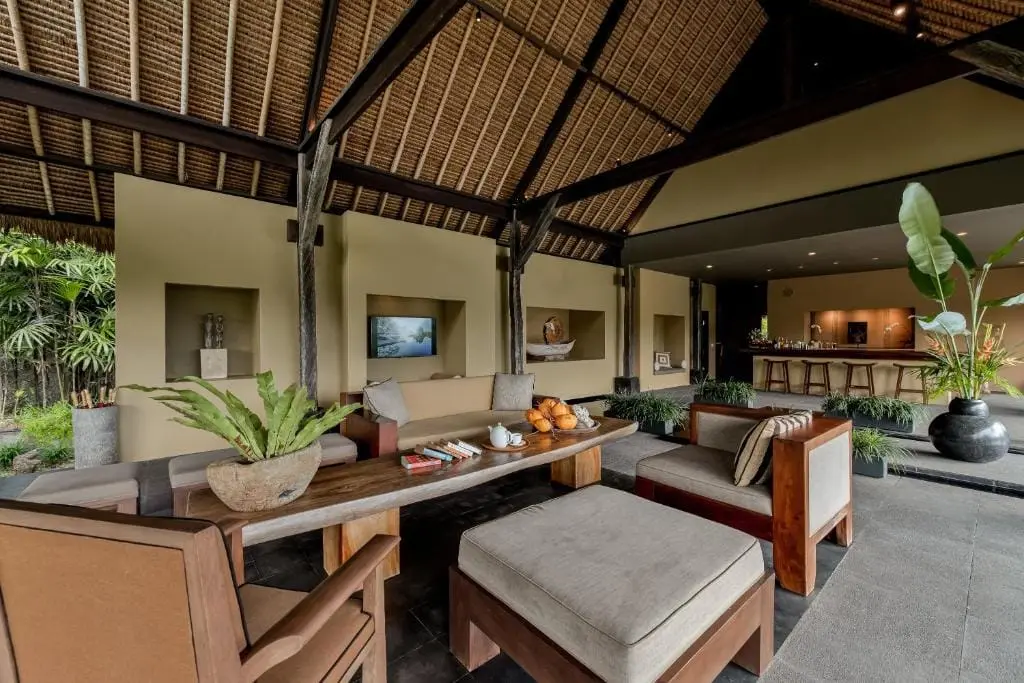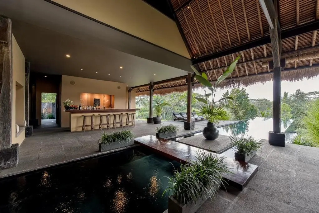 The villa features a clear, blue pool overlooking the cascading paddy fields, providing a refreshing spot for a dip. The pool area offers a panoramic view of the tropical jungle and is the perfect place to relax and soak in the beauty of the surroundings. The living room and kitchen are large, semi-outdoor pavilions located next to the pool and a beautiful pond. The kitchen is fully equipped, allowing guests to prepare meals with ease.