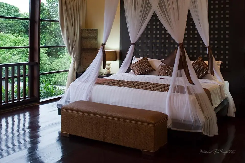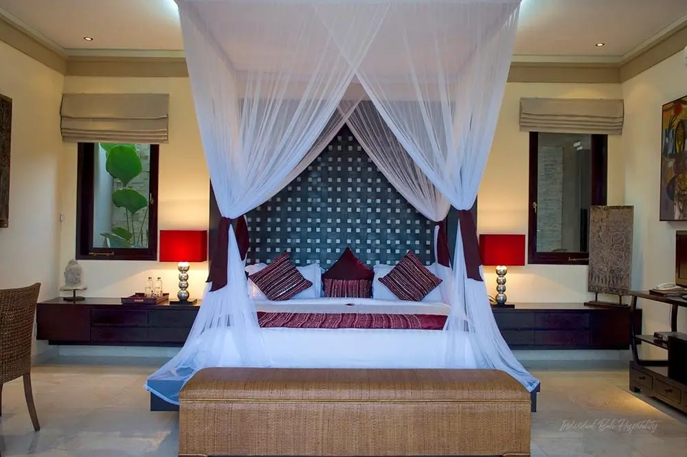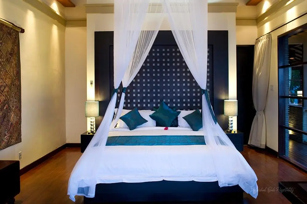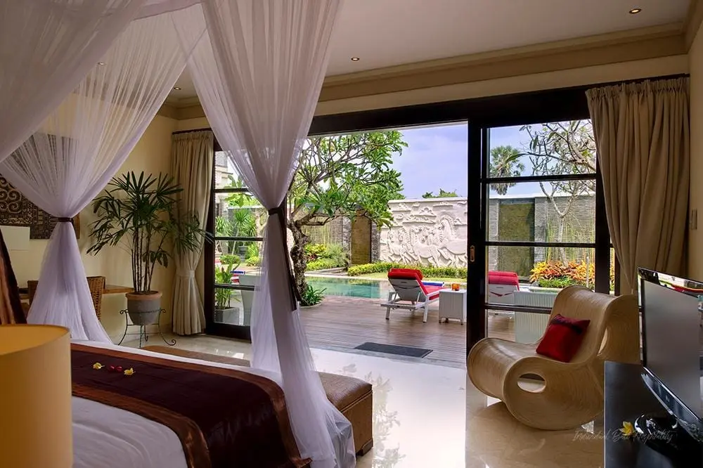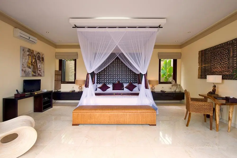 Each of the five bedrooms is spacious, bright and extremely comfortable. Original paintings adorn the walls and objets d’art add Balinese charm. All have immaculate ensuite bathrooms, dressing areas and floor-to-ceiling glass doors, and each is accented with silks and soft furnishings in its own unique colour scheme. All bedrooms are furnished with romantically canopied king-size beds and writing desks, and equipped with satellite-channel TVs and DVD players.