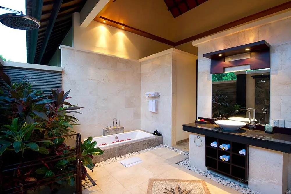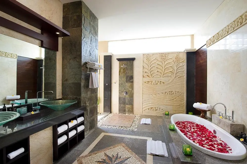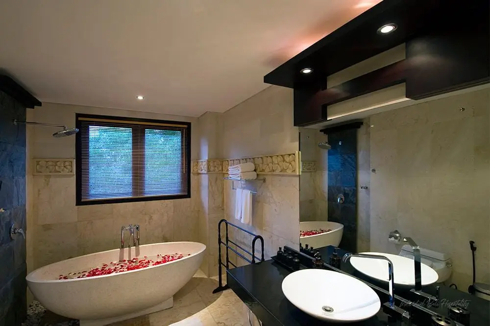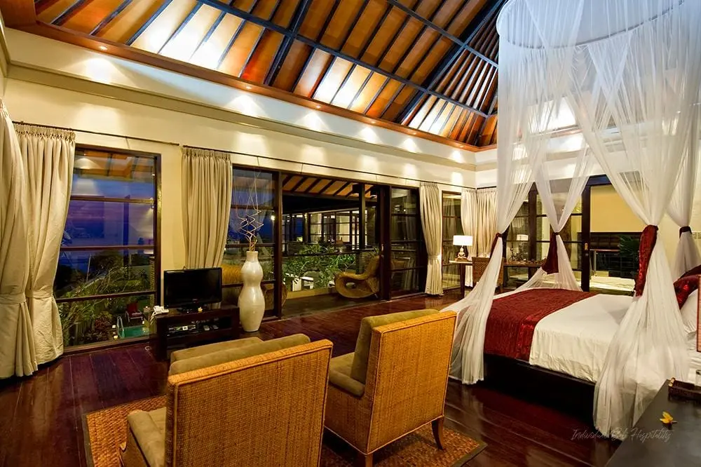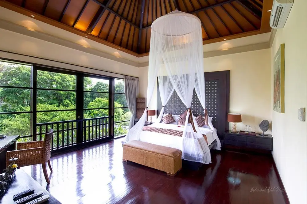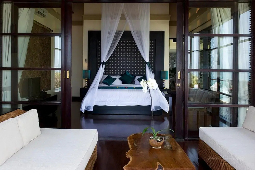 Each of the five bedrooms is spacious, bright and extremely comfortable. Original paintings adorn the walls and objets d’art add Balinese charm. All have immaculate ensuite bathrooms, dressing areas and floor-to-ceiling glass doors, and each is accented with silks and soft furnishings in its own unique colour scheme. All bedrooms are furnished with romantically canopied king-size beds and writing desks, and equipped with satellite-channel TVs and DVD players.