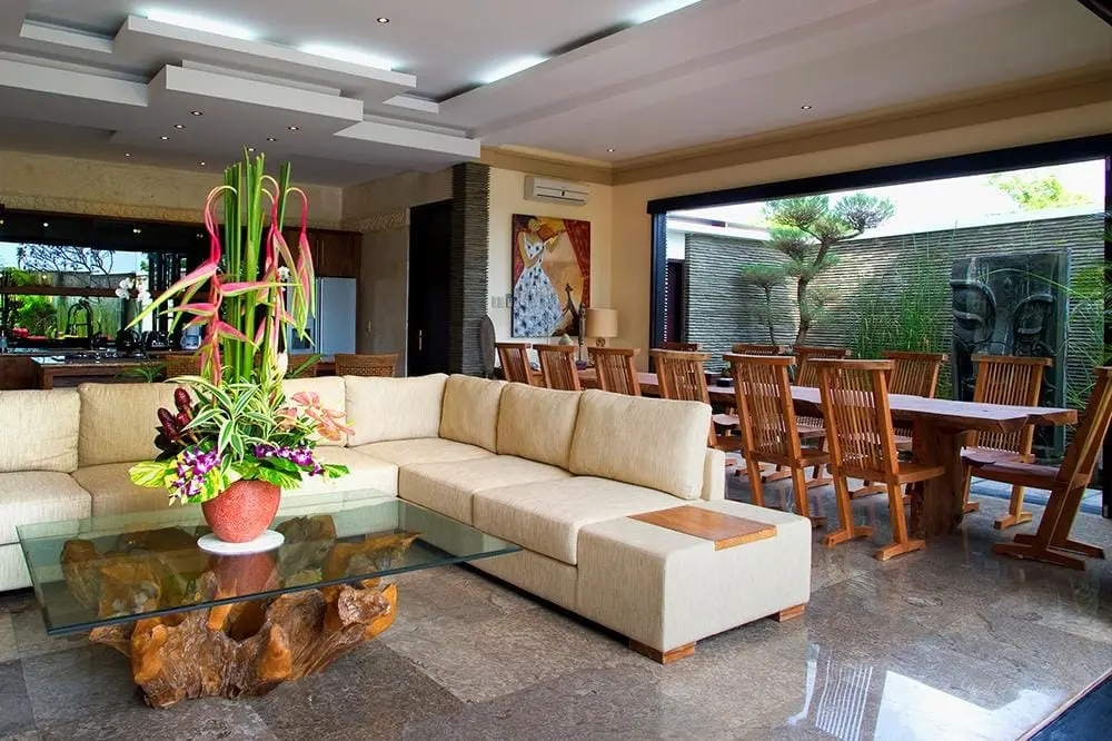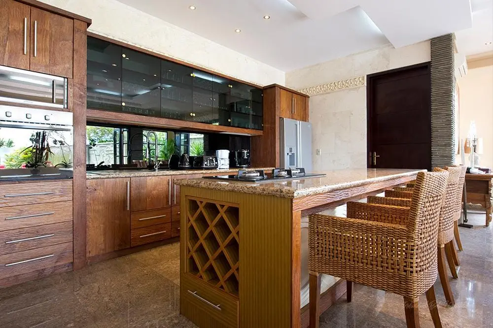 Villa’s generously sized living and dining room has a marble floor and folding glass doors that open to the pool deck, offering guests the choice of air-conditioned comfort or tropical open-air living. The living area is furnished with a yielding L-shaped sofa and a glass-topped coffee table in front of a large flat-screen TV, while the dining area boasts a handsome solid wood dining table for 12. A state-of-the-art, open plan kitchen and breakfast bar fits in neatly to the rear of the living and dining space, and a guest washroom is located to the side.