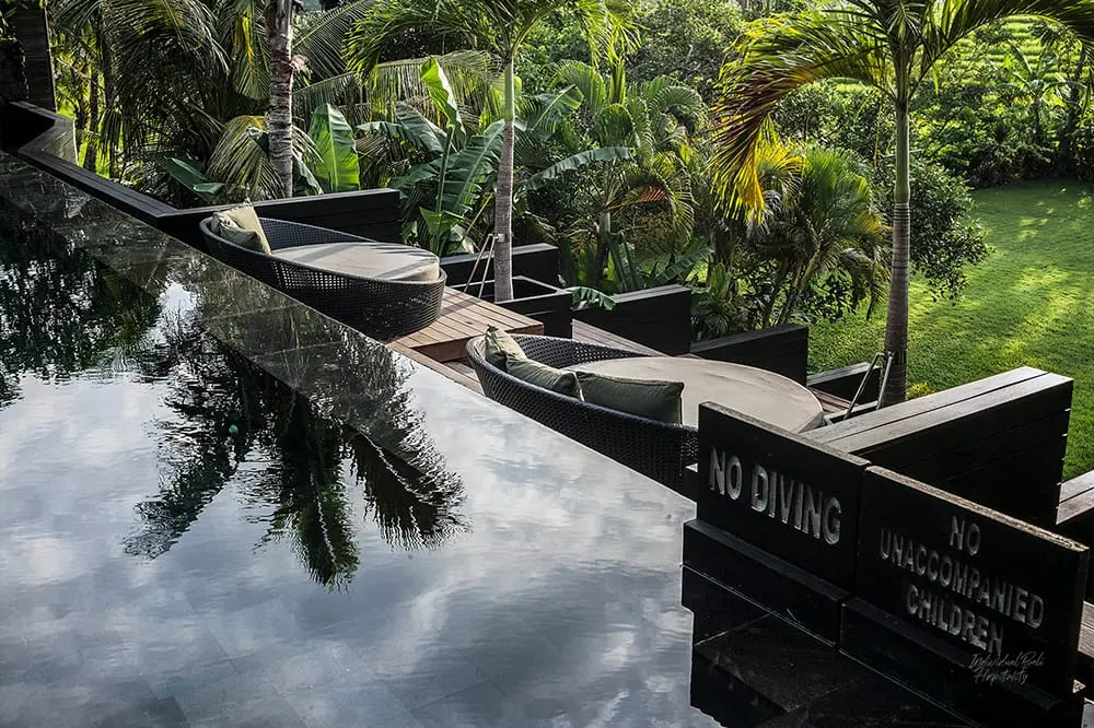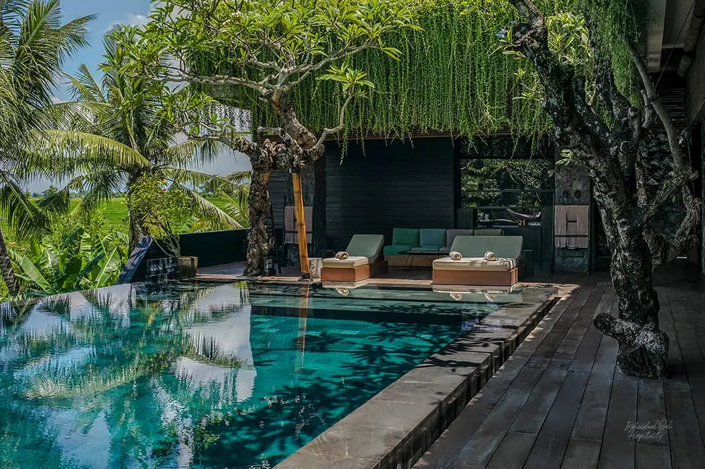 Upon entering Villa Mana, guests are greeted by a wading pool fed by a cascading water wall, leading to a spacious T-shaped living area that seamlessly extends throughout the Villa Mana and wraps around the inviting swimming pool. Accommodation of Villa Mana is spread over two floors: on the ground floor, a corridor off the living area leads to three luxurious bedroom suites on one side, while on the other side, there’s a twin bedroom, a bathroom, a home cinema room, a manager’s office, and an open-plan kitchen. On the upper floor, two more expansive bedroom suites and an office/TV room open onto an enormous terrace adorned with a large pergola. From the pool deck, broad wooden ‘amphitheatre-style’ steps lead down to a sprawling lawn bordered by picturesque rice terraces.