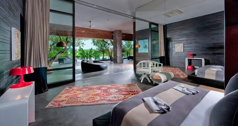 The Villa Mana have six spacious air-conditioned bedrooms boast high ceilings, walls adorned with padded silk, polished-concrete floors, rattan and wood furniture, and sliding glass doors opening onto gardens or terraces. Five bedrooms feature king-size beds, while a twin bedded room is located on the ground floor, opposite the games room/home cinema. All bedrooms of Villa Mana come with large ensuite bathrooms featuring twin basins of polished concrete and statement bathtubs big enough for two.