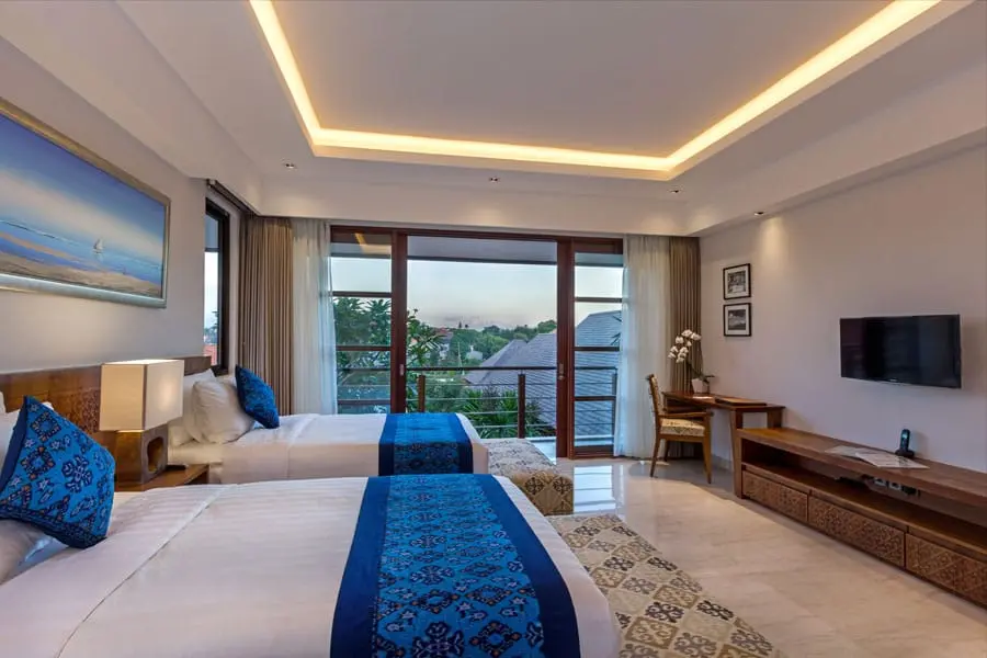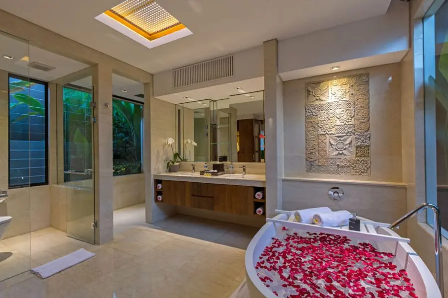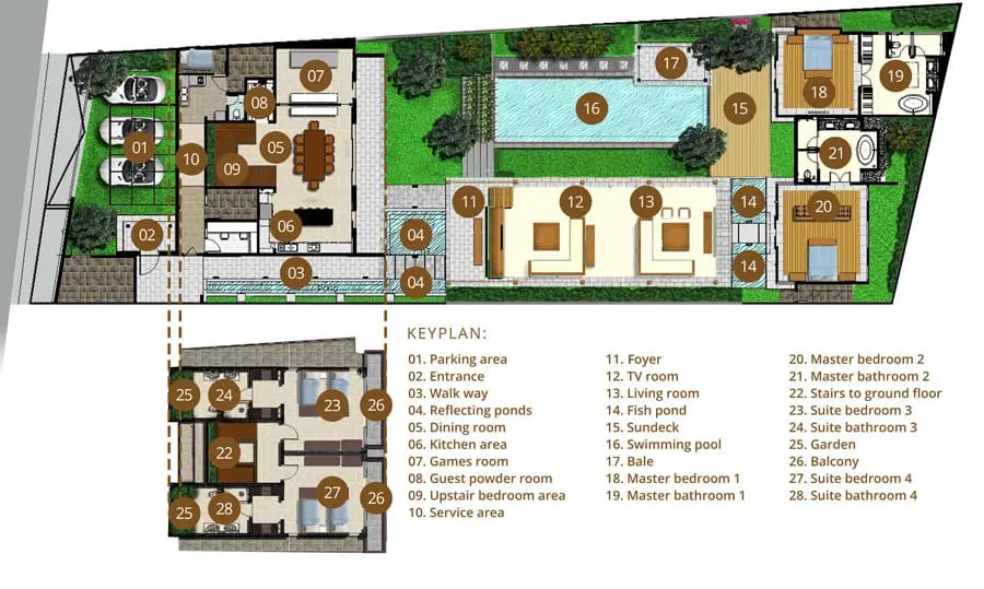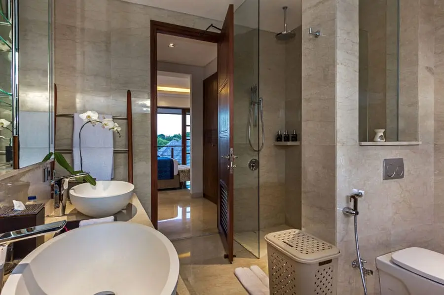 Located on the second floor of the main building, two lovely bedrooms with twin beds offer views of the private pool and garden. Tucked-away closets provide ample storage, and the semi-open bathrooms feature tropical greenery, double basins, and spacious walk-in shower areas.
