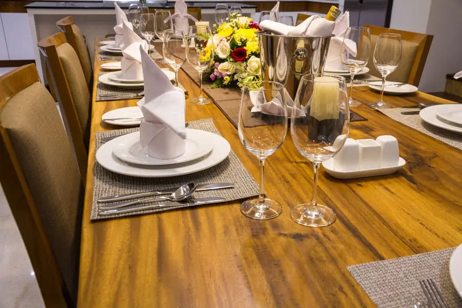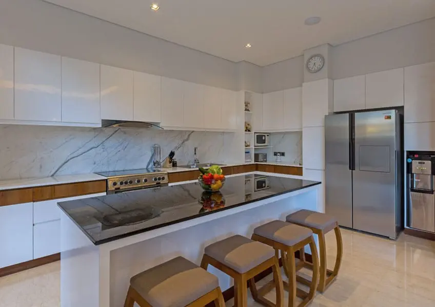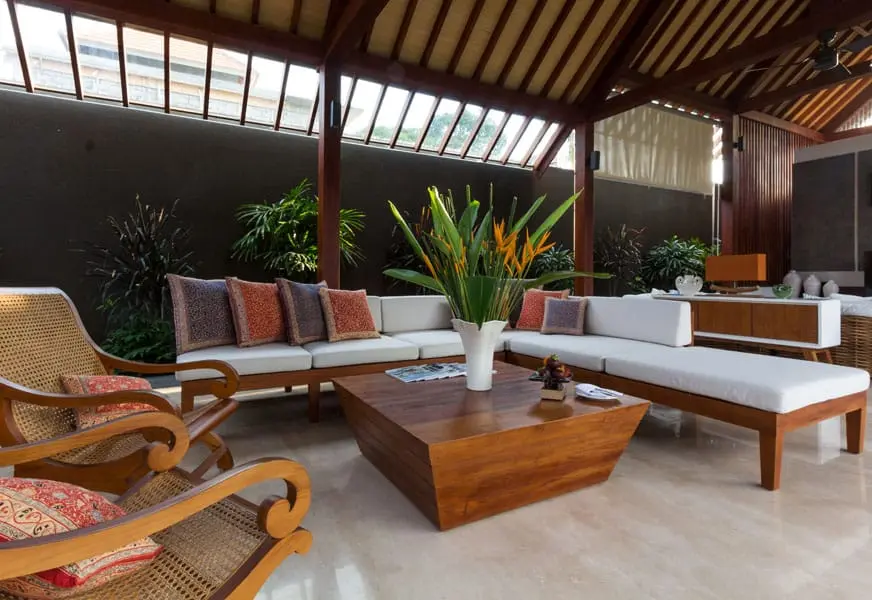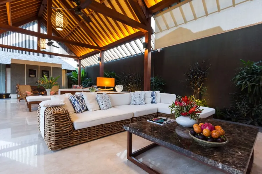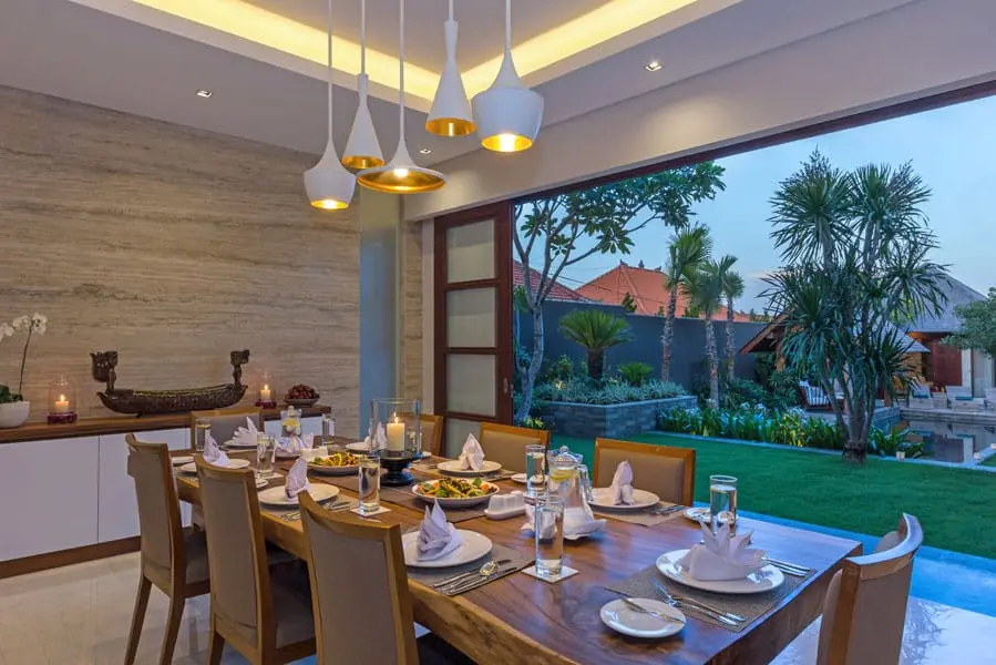 Villa Meliya features a separate dining area overlooking the garden and pool. A beautiful solid wood dining table seats eight, while a kitchen bench with four stools provides additional seating for watching the chef at work or chatting over snacks and cocktails. Sliding doors in the dining room offer the choice of enjoying the natural breeze or a more intimate setting with the doors closed.