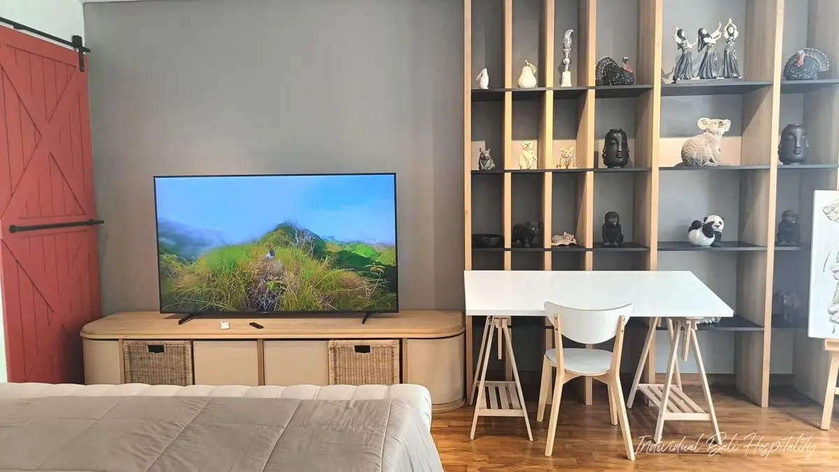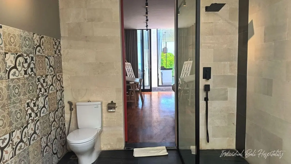 Each of the three bedrooms sits in its own pavilion on the ground floor, ensuring space and privacy. All feature king-size beds, smart TVs with Netflix, air-conditioning, work desks, and spacious bathrooms, with two offering luxurious stone bathtubs. The master bedroom also includes a private patio with sun loungers and a BBQ corner. For elevated relaxation, guests can enjoy the rooftop covered in natural grass, perfect for sunbathing with panoramic sea views.