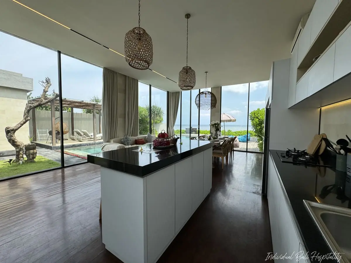 - Modern kitchen pavilion with A/C, ocean views, and indoor–outdoor dining options