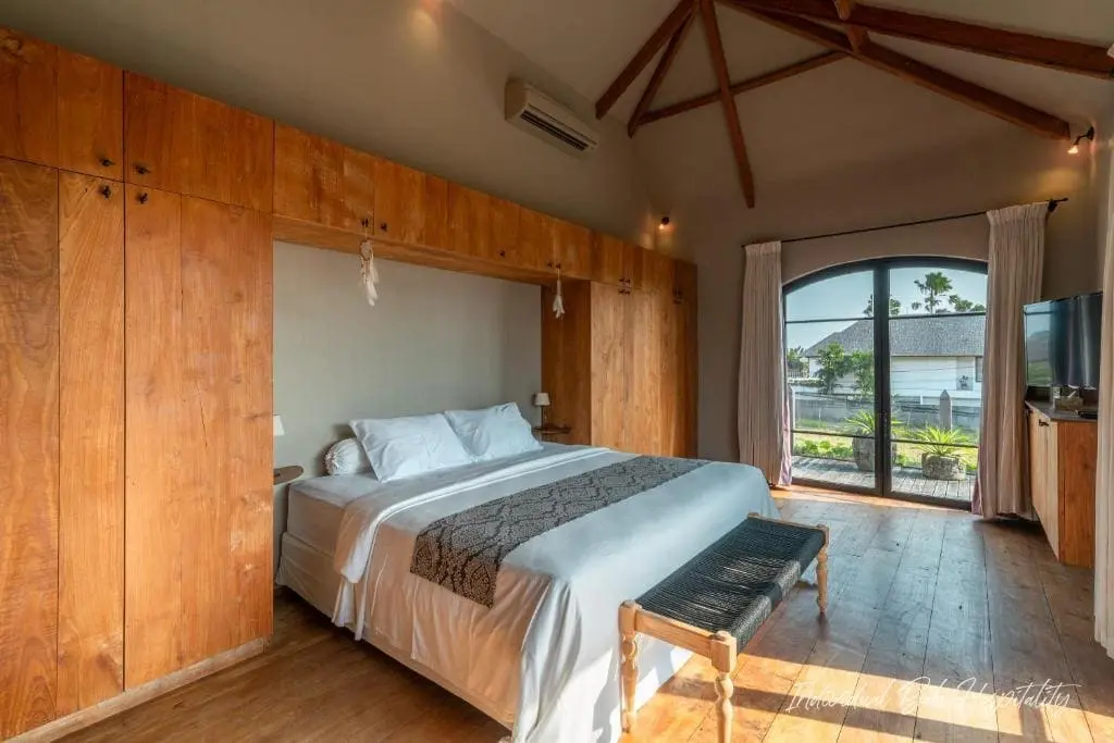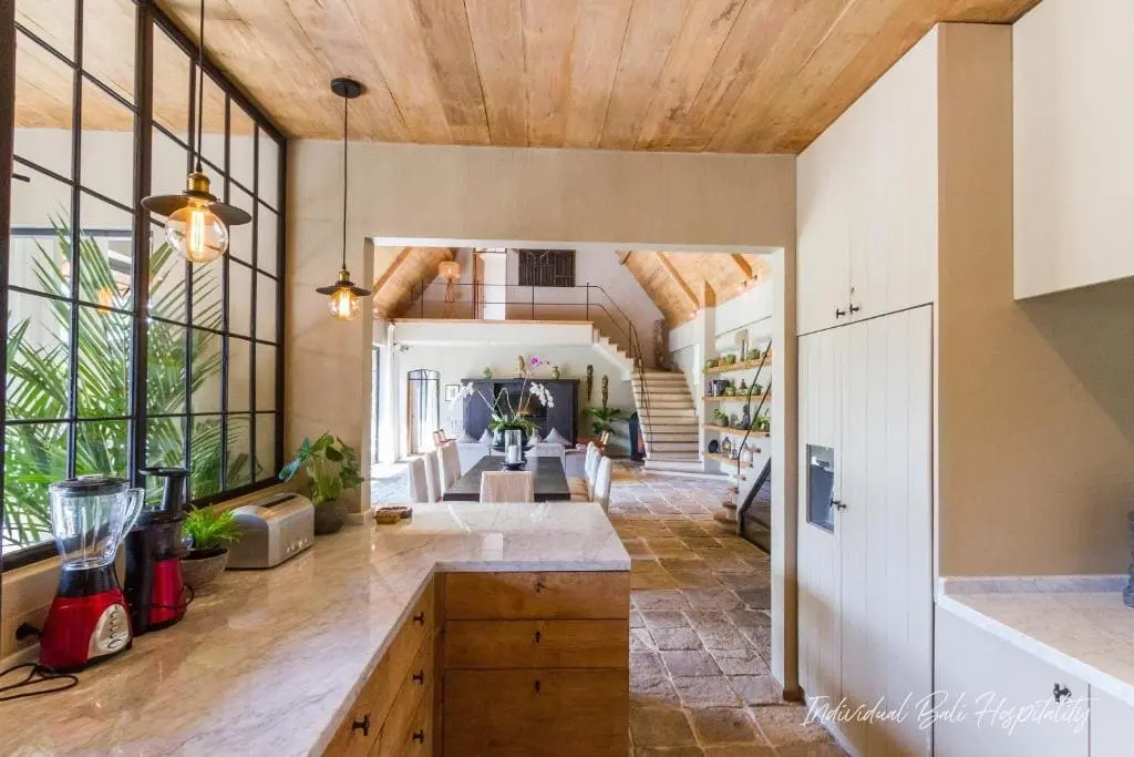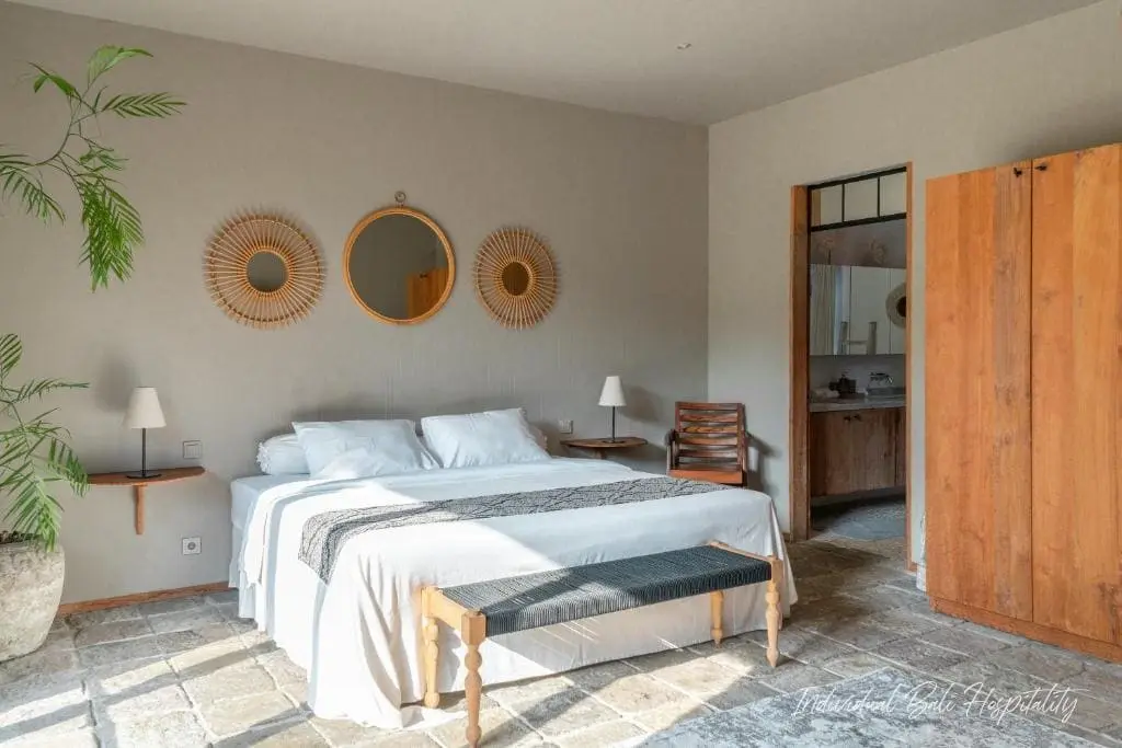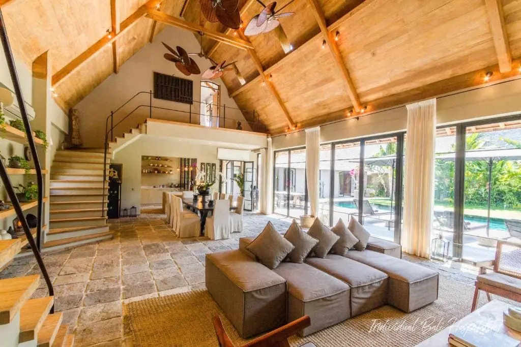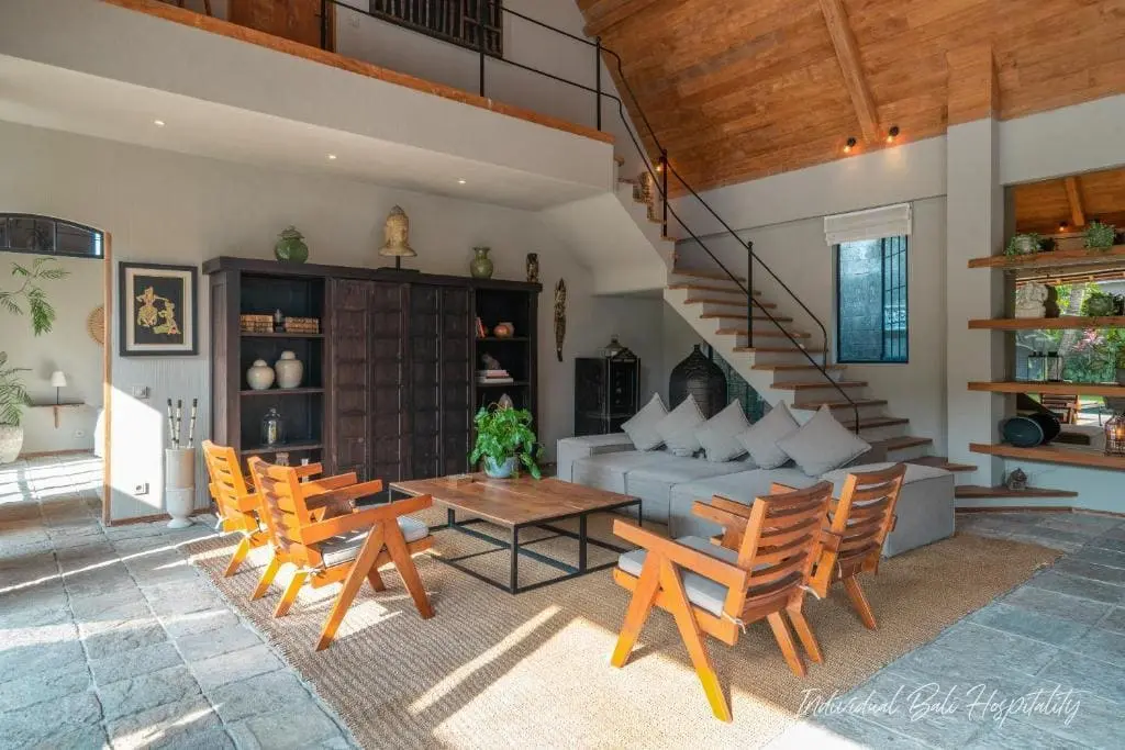 The interior features a high-ceilinged living room with stone floors, curated décor, and natural textures that echo Bali’s warm and relaxed atmosphere. Floor-to-ceiling glass doors open to the private garden and pool area, bringing in natural light and fresh coastal air.