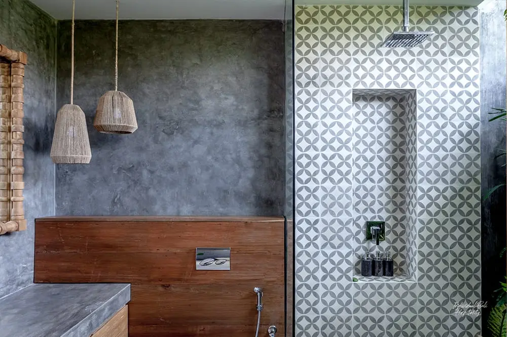 Villa Nonnavana features a sophisticated blend of elements and textures, including smooth cement, organic rattan, warm wooden tones, chic tiles, and punctuated metallics, creating an ambiance of modern elegance. Natural light floods each space, accentuating clean, modern lines and lush greenery. Villa Nonnavana boasts four chic en-suite bedrooms set around a central private pool, three of which offer large king-sized beds while the fourth is a designated kid’s room with a bunk bed. Masterfully designed bathrooms with poured concrete and beautiful stonework add to the luxurious feel.
