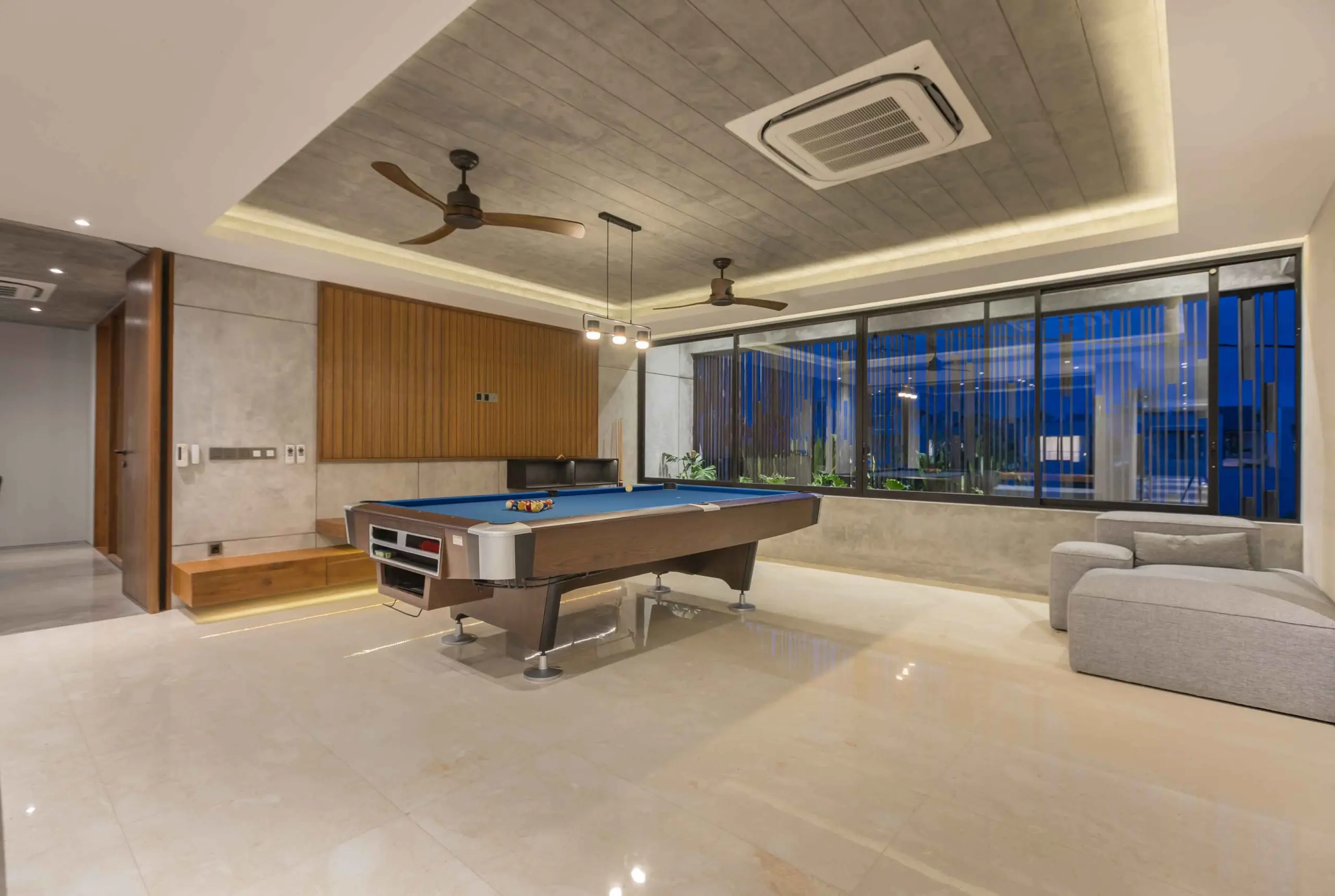 Inside Villa NVL Canggu, each bathroom boasts contemporary design elements, featuring luxurious bathtubs and high-tech toilets inspired by Japanese technology. Villa NVL Canggu also boasts a fully furnished modern kitchen, a dining room, and a living room adorned with tasteful artworks. Entertainment options abound, with a fully equipped entertainment room featuring a home gym and an International-sized billiard pool table, ensuring endless fun for families, kids, and friends alike.
