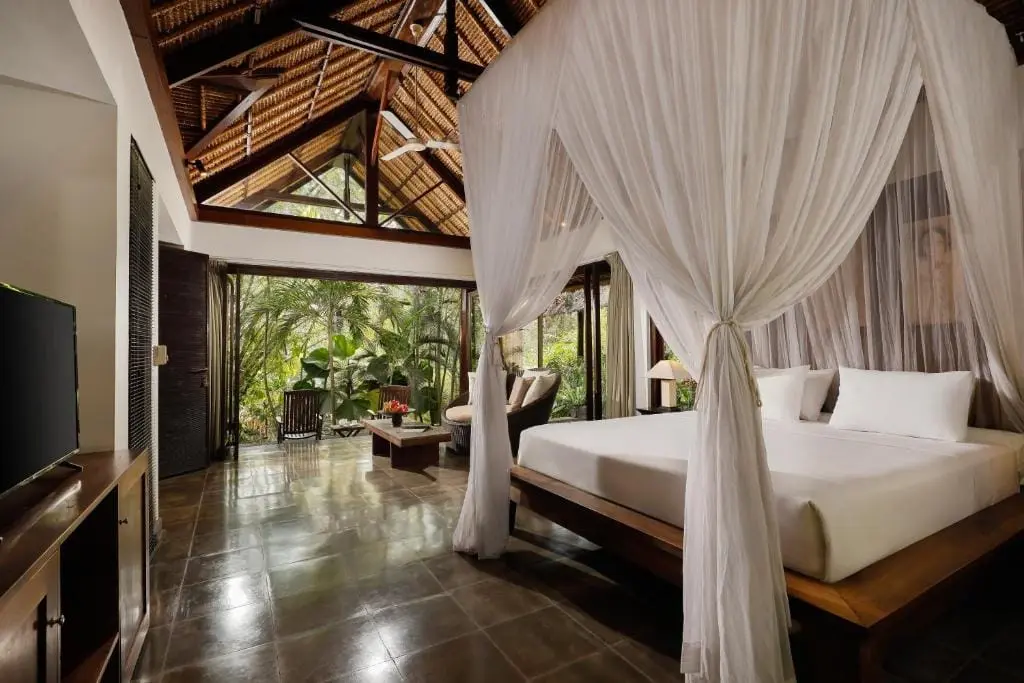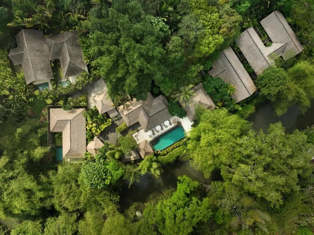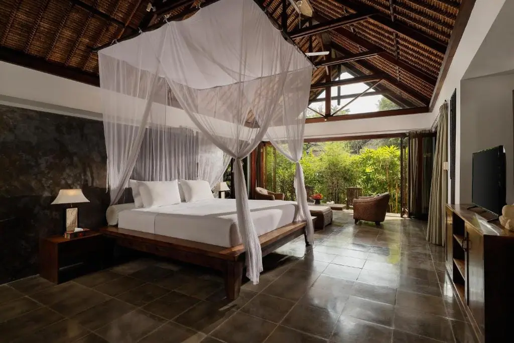 Traditional thatched-roofed pavilions dot the landscape, overlooking the Penet River and clusters of towering bamboo. Omecure’s design concept is deeply rooted in the tropical essence of the island, seamlessly integrating with the surrounding forest and jungle. One guest shared, “You get in touch with nature as the property is a retreat. All you hear is the sounds of birds, frogs, and other forest creatures, but it’s very calming.”