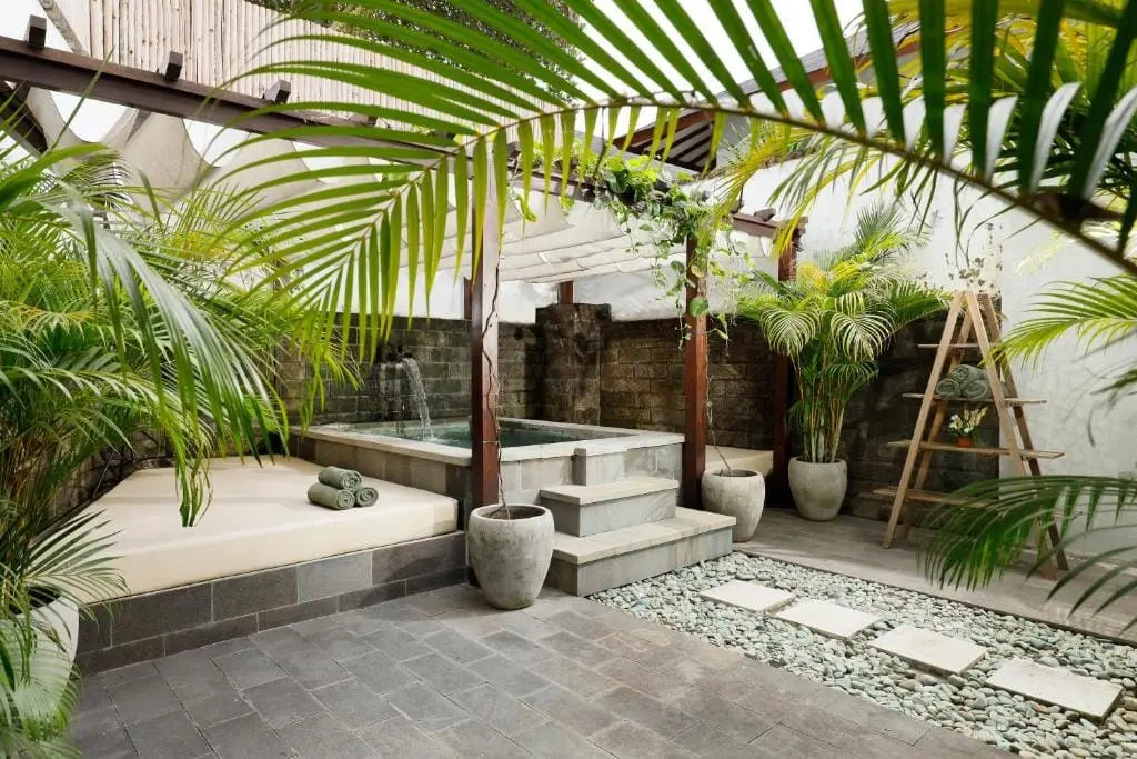 Indulge in the private spa area, which boasts a generous jacuzzi space similar to those found in 5-star resort spas. Limestone steps lead into the warm, inviting waters, creating a tranquil space to unwind and rejuvenate.