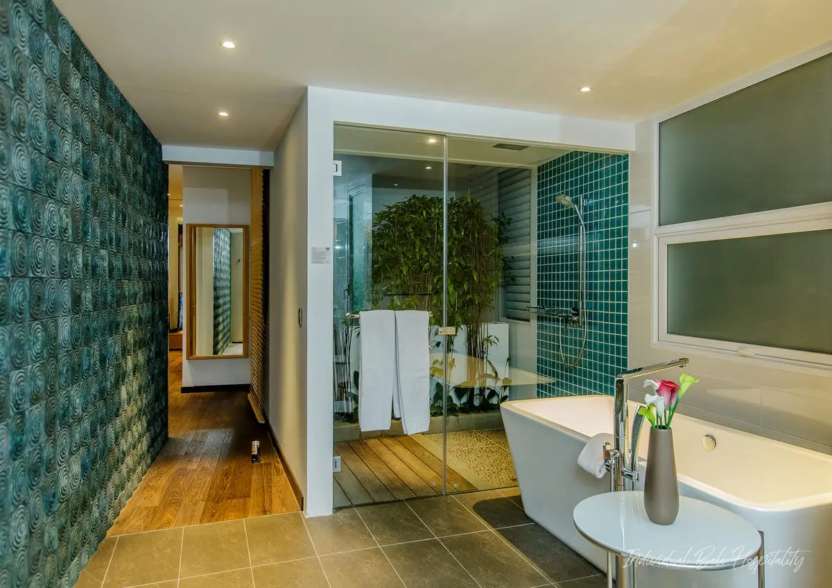- High-end amenities including walk-in showers, bathtubs, bathrobes, slippers, toiletries, and hair dryers