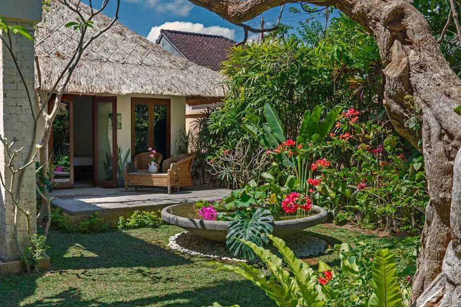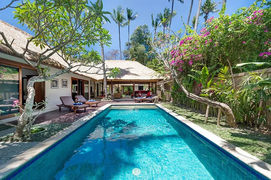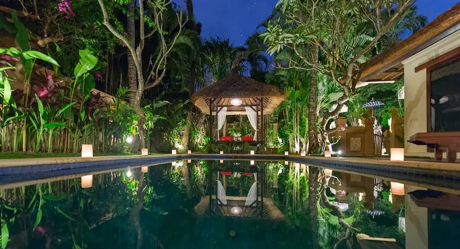 Villa Plawa is a classic Bali luxury villa that exudes authenticity and charm, offering a tranquil retreat in the heart of Seminyak. Its spacious old-growth gardens provide a perfect place to relax amidst the bustling shopping, dining, and nightlife district. Recently renovated in late 2013, Villa Plawa blends classic Balinese “kampung” architecture with modern convenience. Set on a large piece of land for Seminyak, over a quarter of an acre, the villa is carefully constructed around magnificent old coconut and mango trees. Scattered throughout this Balinese “forest” are various living and bedroom pavilions, a small Hindu temple, and a private swimming pool with a hardwood deck.