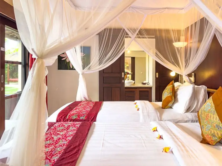Villa Rama is a tastefully decorated single-storey villa with three bedrooms. Two identical guest houses are separated by a wooden bridge over the pool and a beautiful Buddha relief, while the third bedroom is attached to the main building. All bedrooms are air-conditioned and feature ceiling fans, king-sized beds (with one guest house convertible to two single beds), spacious wardrobes with safety deposit boxes, and en-suite bathrooms with open-air showers. Each bathroom is fully supplied with hair dryers, guest shampoo, conditioner, soaps, and moisturizers.