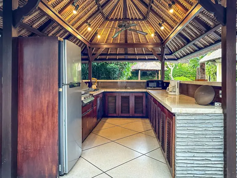 The main building is designed for personal comfort, overlooking the swimming pool and tropical gardens. It features a large living space with modern entertainment systems and a big screen TV with satellite channels including movies, news, cartoons, and sports. The living area is an open space with a big ‘L’ shaped locally made Rattan Sofa, a teak sofa bed, and a teak coffee table. The grand dining table and chairs are located nearby, and the kitchen, housed in a separate pavilion, includes a huge BBQ, gas stove, microwave, coffee maker, juicer, and water dispenser. For added comfort, the living area can be enclosed with a mosquito curtain in the evenings.