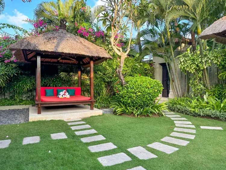 The villa’s grounds feature a thatched pavilion over a daybed next to the pool (The ‘Bale’), providing a shady spot to stretch out with a book or enjoy a massage. There’s also an outdoor garden shower close at hand. At the end of the garden, a stone terrace is perfect for casual alfresco dining with friends and loved ones, complete with sun beds and a shady umbrella. The stunning Buddha water feature and infinity pool are the glistening focal points of Villa Rama, surrounded by lawns, gardens, and tropical plants.