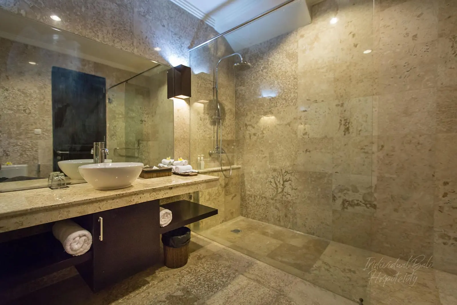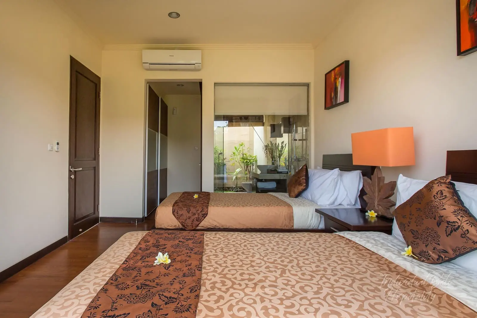 This unit is perfect for a small family who wants to get away from it all. This villa contains two fully air conditioned bed rooms, one room with a king sized bed and one room with two twin beds. Each bedroom has their own bathroom, one with a beautiful Balinese style bathtub and shower and one with a large in glass shower.