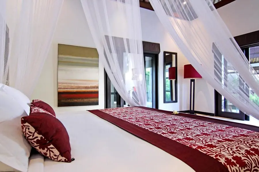 The bedrooms are elegantly appointed with quality furnishings, providing a relaxing space to unwind. The spacious master bedroom features a king-size bed, ample storage, and a stunning en-suite bathroom with a large stone bath and an outdoor shower in a pebble-clad garden, creating a serene atmosphere for relaxation. Two additional spacious bedrooms offer beautiful decor and can be configured with king-size or king single beds to accommodate all guests comfortably. All bedrooms are equipped with air conditioning, mosquito nets, TV/DVD players, and safe-deposit boxes.