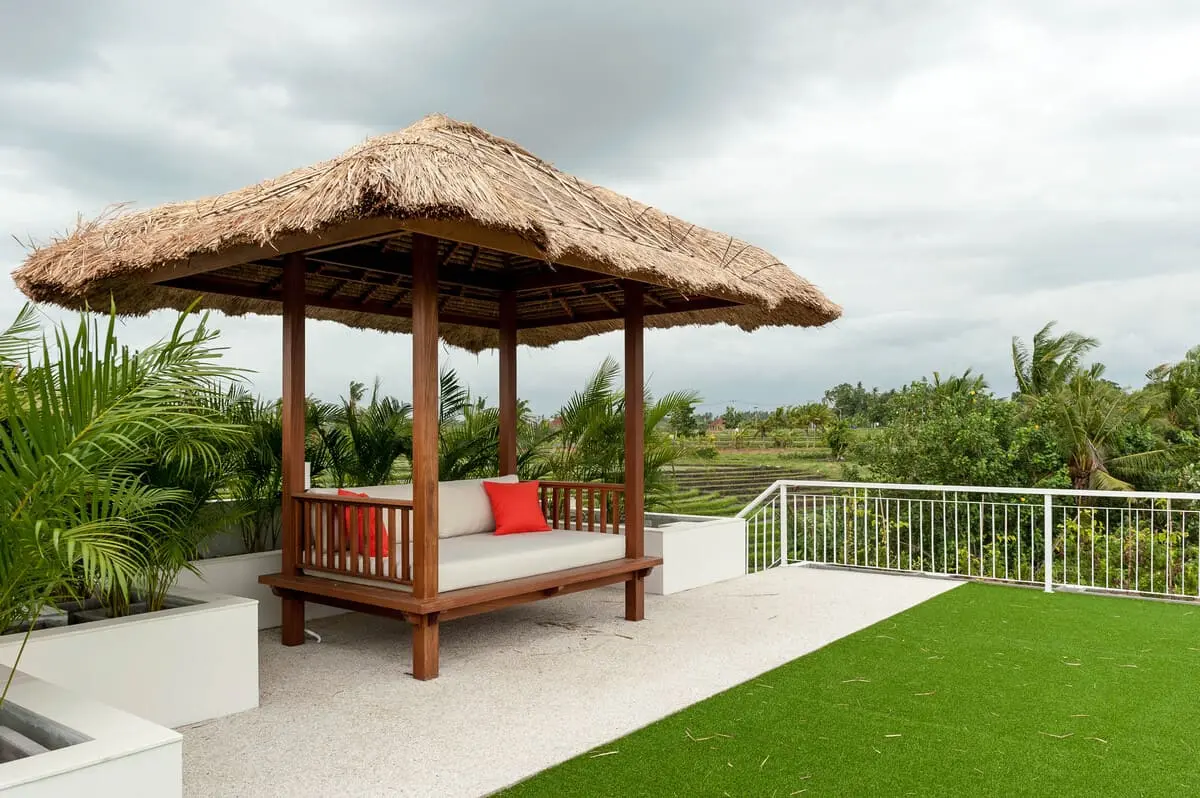 The villa’s open-space design is perfect for families, providing a comfortable and family-friendly atmosphere. Guests can relax in the private plunge pool located next to the living room, or swim in the 16-meter lap pool in the garden. The villa also features a private balcony offering views of the surrounding rice paddies and distant volcanoes, as well as a rooftop hangout where guests can witness breathtaking sunsets over the nearby ocean.
