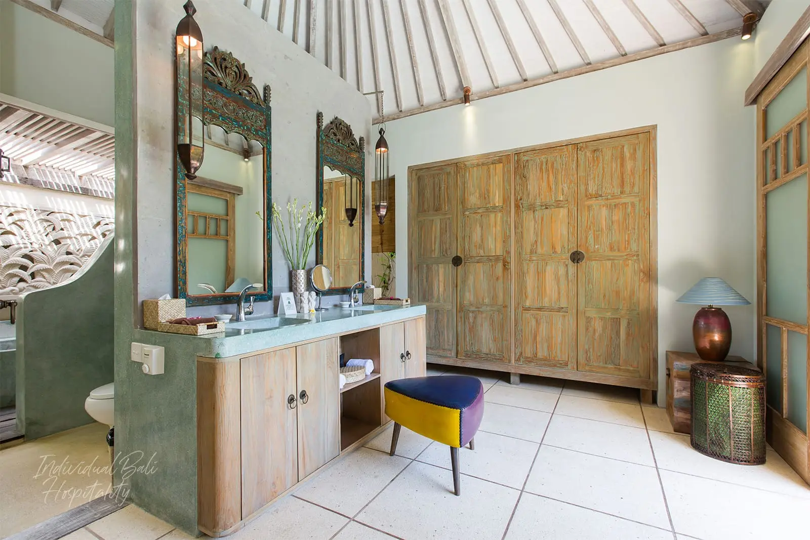 The two air-conditioned bedrooms on the upper floor, accessible by a recycled ironwood staircase, each have an en-suite bathroom with a bathtub and shower. One bedroom has a king-size bed, while the other has twin beds that can be converted into a king-size bed. All rooms are equipped with a TV, DVD player, iPod dock, and safe-deposit box for your convenience.