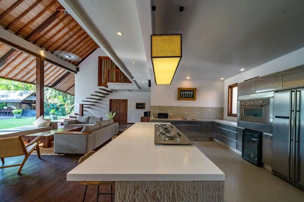 The highlight of Villa Tirtadari is its 25-meter private pool and beautifully manicured lawn, offering a serene setting for relaxation and enjoyment. Each of the 7 bedrooms boasts its own alfresco en-suite bathroom, rich wooden flooring, thatched high ceilings, and generous glass-sliding doors that welcome natural light. The compound includes 6 king-size beddings, with one room featuring a four-poster frame for a regal touch. The rooms are tastefully decorated with earthy-toned sheets and eclectic art pieces, complementing the villa’s oaky, golden glow.