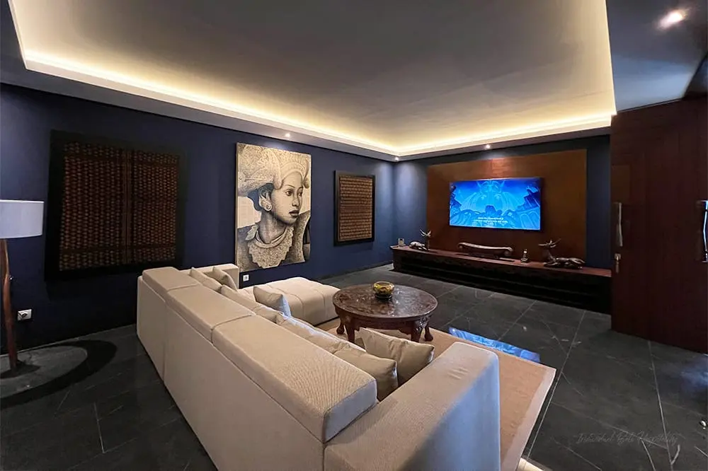 The villa features luxurious amenities matched by the luxuriousness of space, with two infinity pools creating a sense of endless sparkling water. Thoughtfully designed to capture views of the black sand beach, the villa offers shady furnished verandas, poolside balés, and sumptuous air-conditioned living areas with floor-to-ceiling glass. A remarkable collection of Indonesian antique furnishings, wood carvings, and artwork enhances the sense of place. Lush tropical gardens, terraced lawns, and expansive pool decks make it an ideal destination for weddings. As the spectacular sunsets give way to enchanted evenings, the leafy tropical gardens are illuminated by spotlights and hurricane lanterns, while the pools glow with an iridescent sapphire blue.