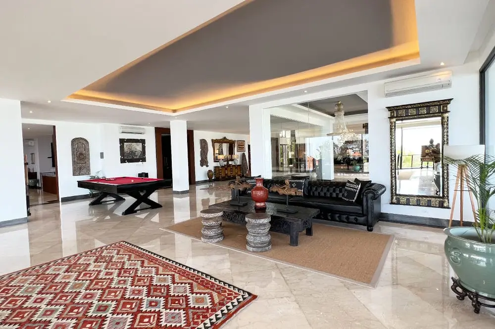 Villa Tirtha Bayu Estate – Villa I is an exquisite 6-bedroom family villa located in Seseh, offering a luxurious retreat nestled between emerald green rice fields and the glistening sea. More than just a villa, it provides a unique opportunity to experience the Balinese Hindu concept of tri hita karana, ‘the three causes of happiness,’ defined by connection with nature, with people, and with god/the divine. This stunning spot, with the soothing sound of crashing waves and ornate Hindu temples reachable via a scenic clifftop path, offers the perfect setting to reconnect with family and friends and find happiness through rejuvenation and restoration.