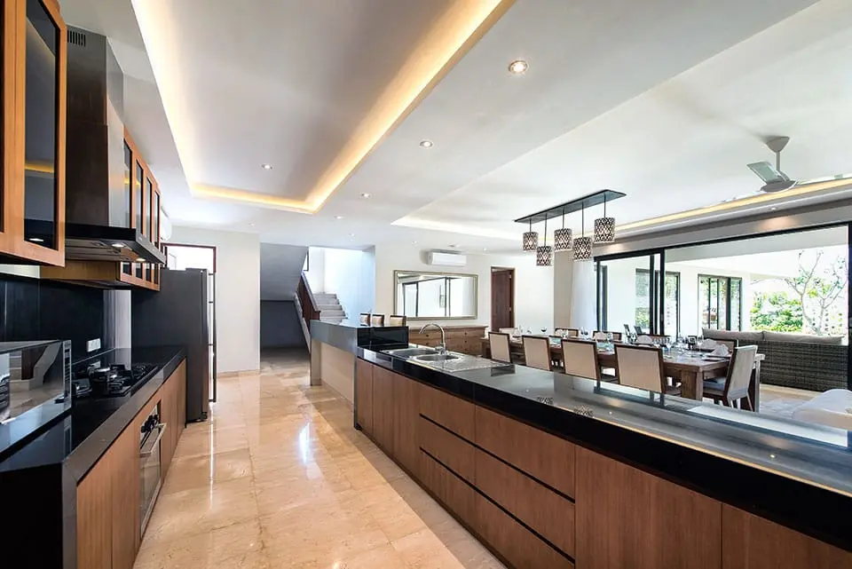 Descending further into Villa Yamuna reveals the primary living area, which boasts a European-designed kitchen, a sturdy wooden dining table, and additional seating areas. This space is designed for comfort, with air conditioning, hanging lamps, and high-quality fabrics creating a welcoming atmosphere. A striking gilt-framed element adds a touch of elegance, enhancing the sense of spaciousness.