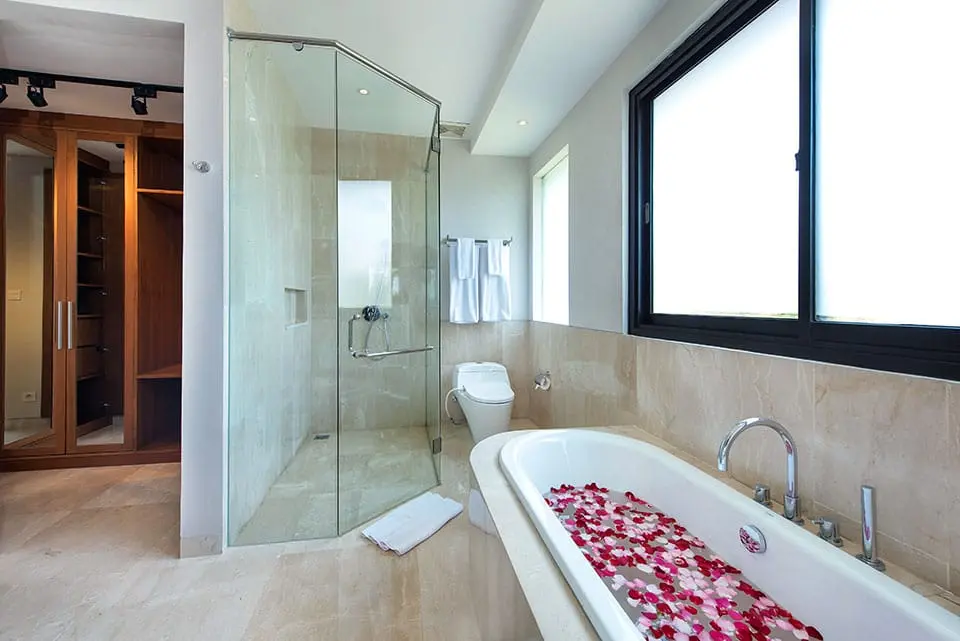 Villa Yamuna accommodation options are equally impressive. The left wing, adjacent to the main upstairs living area, houses two elegant bedrooms that run parallel to the pool. The master bedroom, with its sophisticated grey and regal red palette, features glass doors that provide pool and ocean views. It includes a king-sized bed, a cozy couch, and an ensuite bathroom equipped with a rainfall shower and bath. The nearby twin room of Villa Yamuna , adorned in mint green and gold, enjoys its own ensuite and ample natural light at Villa Yamuna .