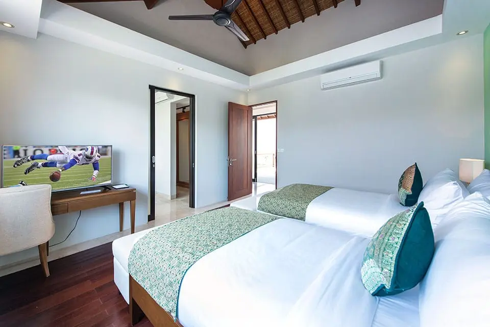 On the lower level of Villa Yamuna, another twin room offers comfort and privacy, with a desk, cable television, and an ensuite bathroom. Its chocolate and caramel tones evoke a distinctly masculine ambiance. The largest twin bedroom  of  Villa Yamuna  faces the garden, offering guests the choice of enjoying the breeze through glass-fronted doors or the comfort of villa-wide air conditioning.
