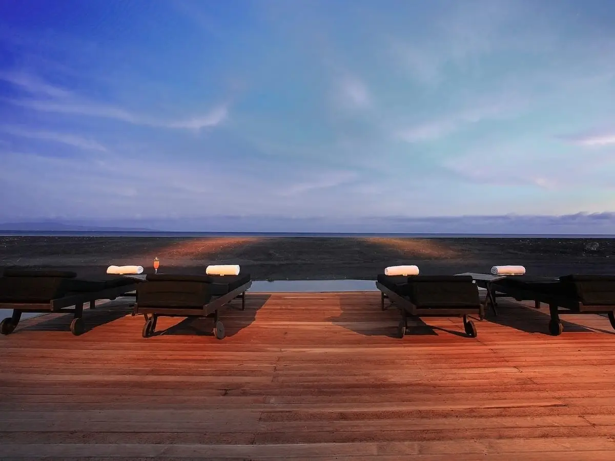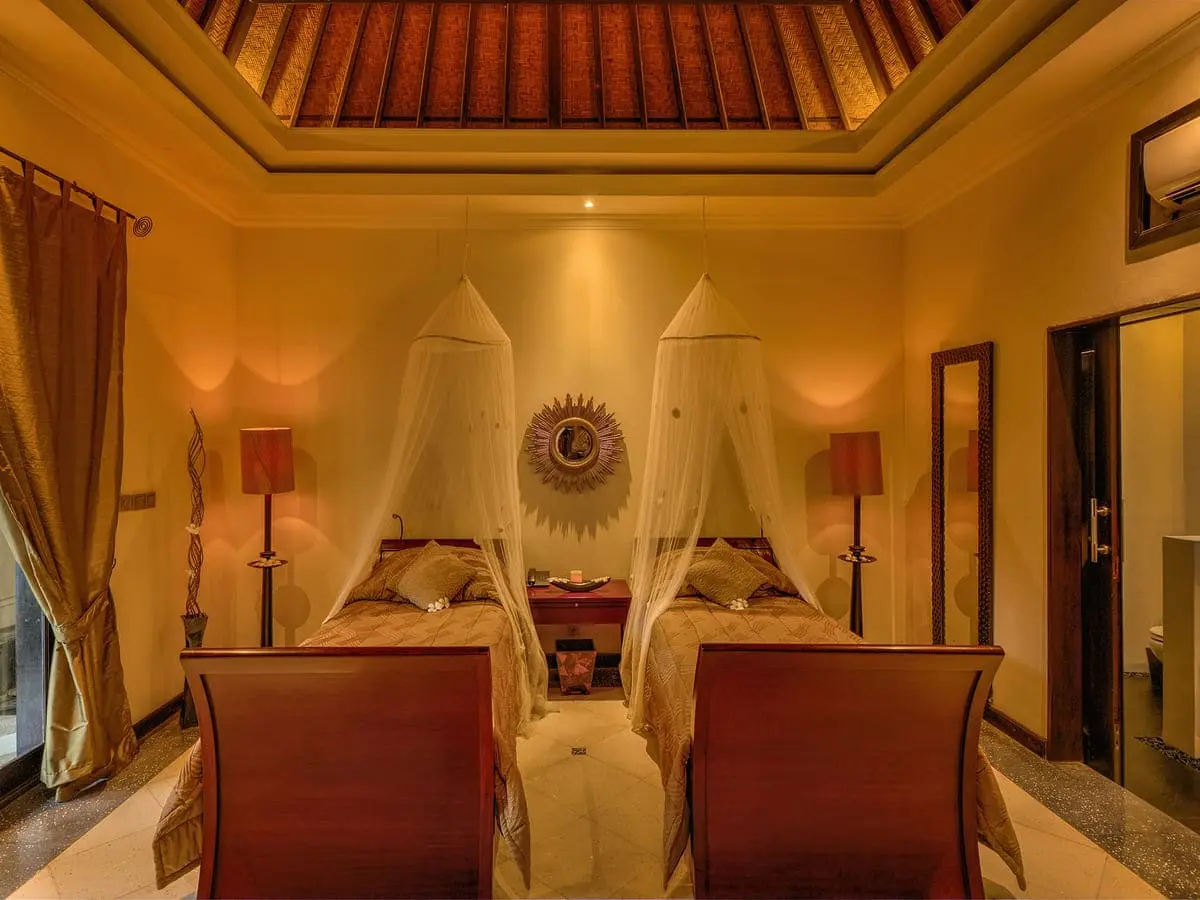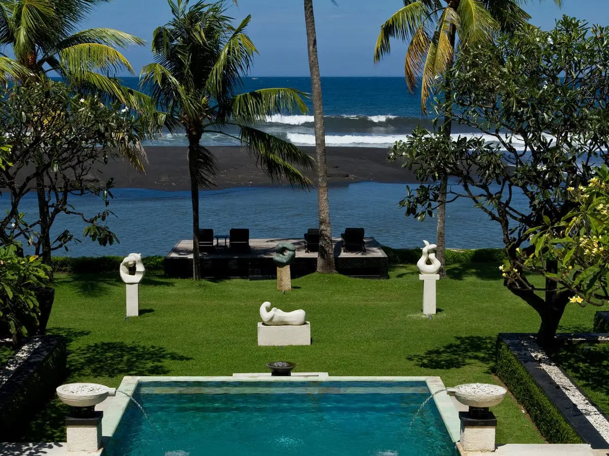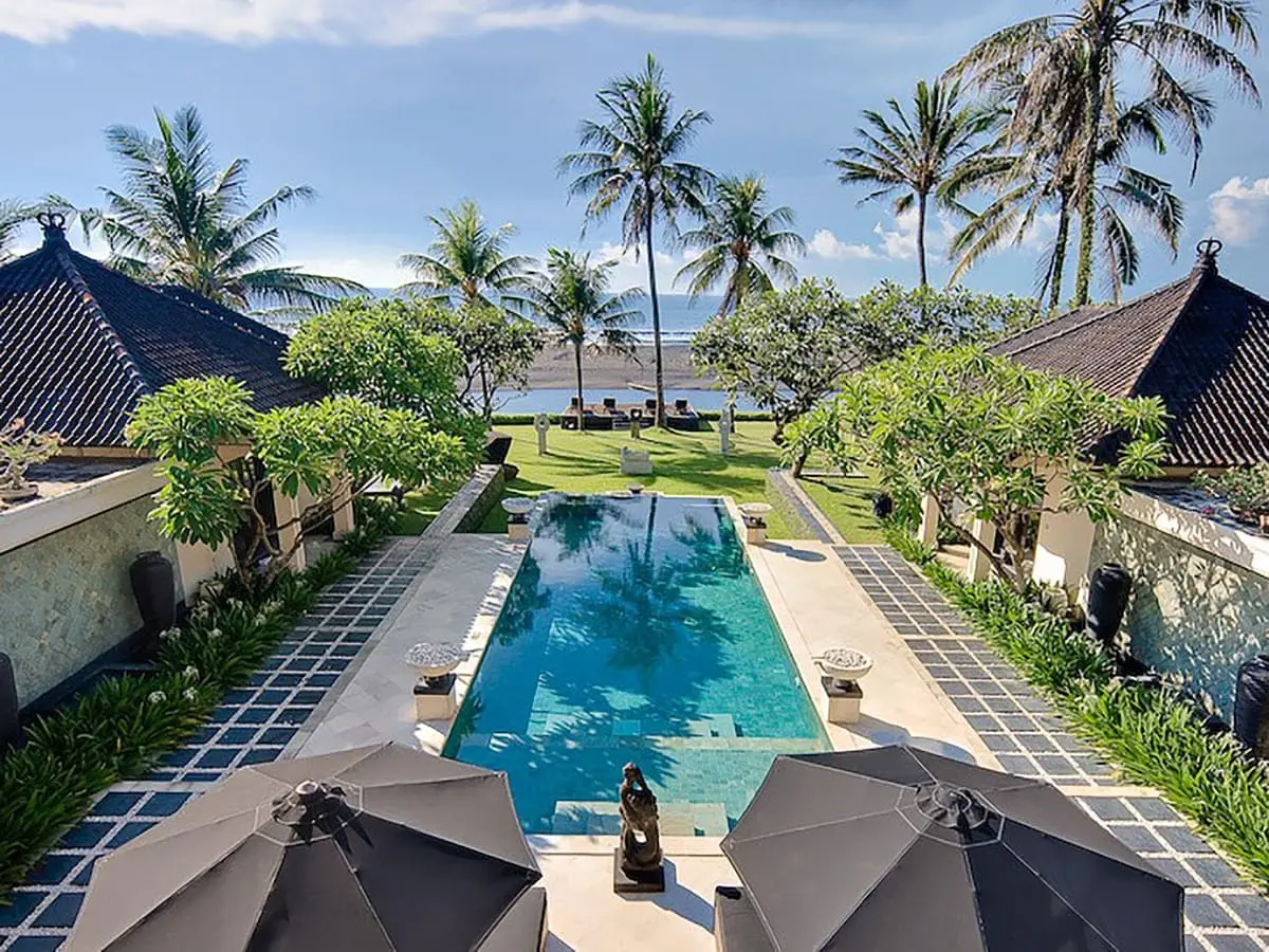 Villa Ylang Ylang is a luxurious six-bedroom oceanfront residence in Ketewel, Gianyar, Bali. Nestled amidst coconut trees and white sands, this villa epitomizes luxury and glamour, offering a lifestyle of ‘passionate serenity.’ The interiors are tastefully designed with exquisite tastes and sophisticated facilities, including a 16-meter pool, gym, and home theatre. The villa’s secluded beachfront location overlooking the Badung Strait, along with its amenities for yoga, spa, and relaxation, provides a retreat of absolute calm and well-being.