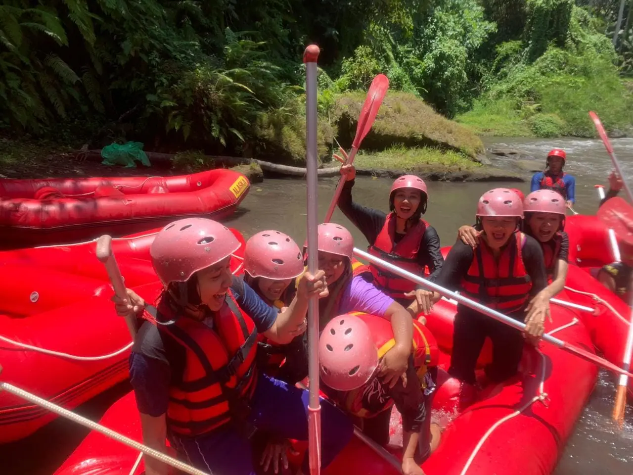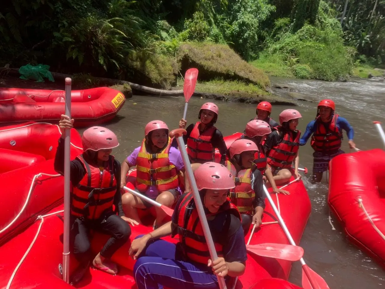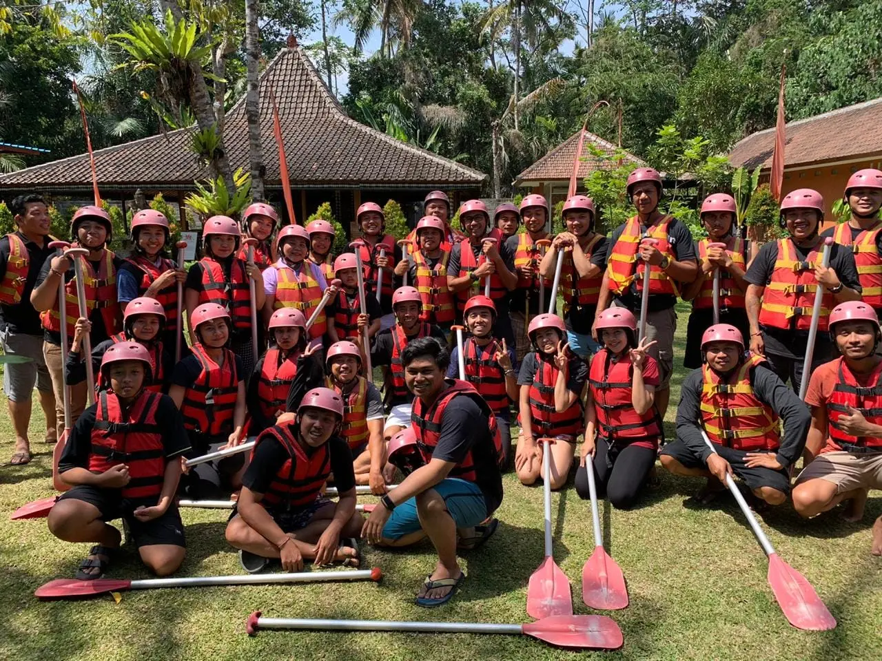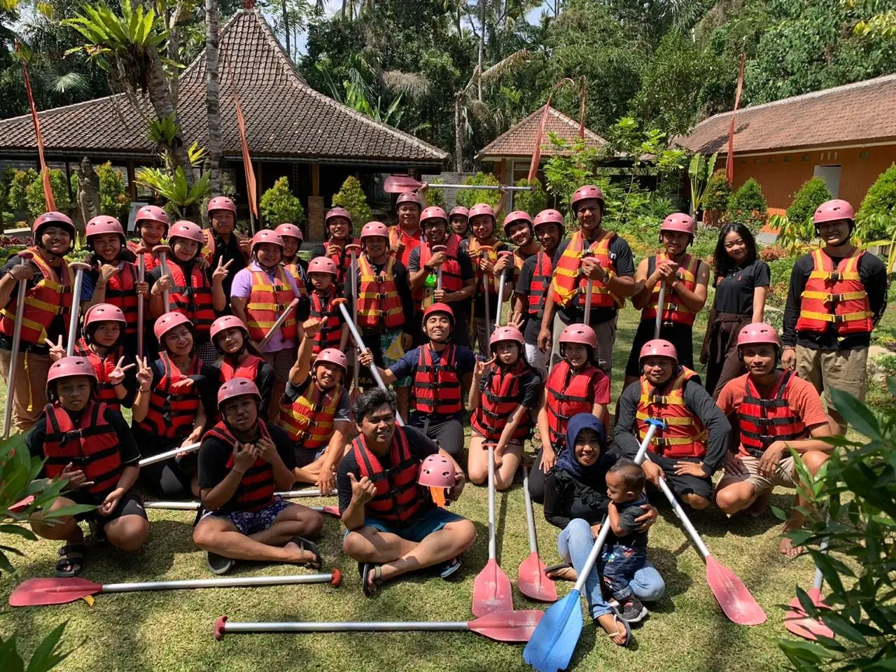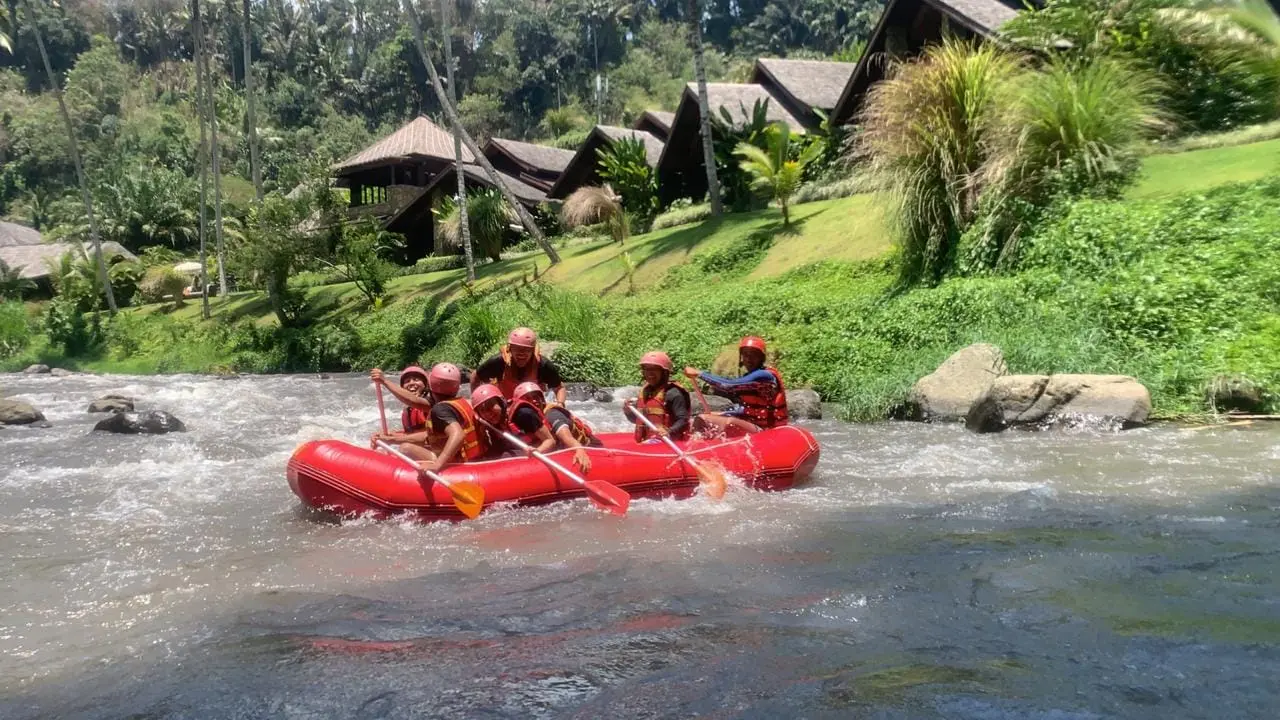 The event which started at 10:00 am was filled with rafting together for 2 hours on the Ayung river, through the Bongkasa line. It seemed that all the teams were happy and there were even some people who were the first time to join in this rafting sport. Then the event continued with celebrating anniversarry, lunch together, fun games, lucky draws and suave.
