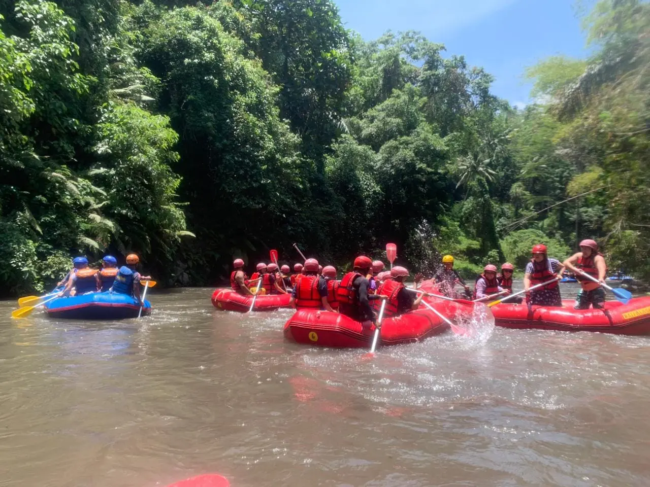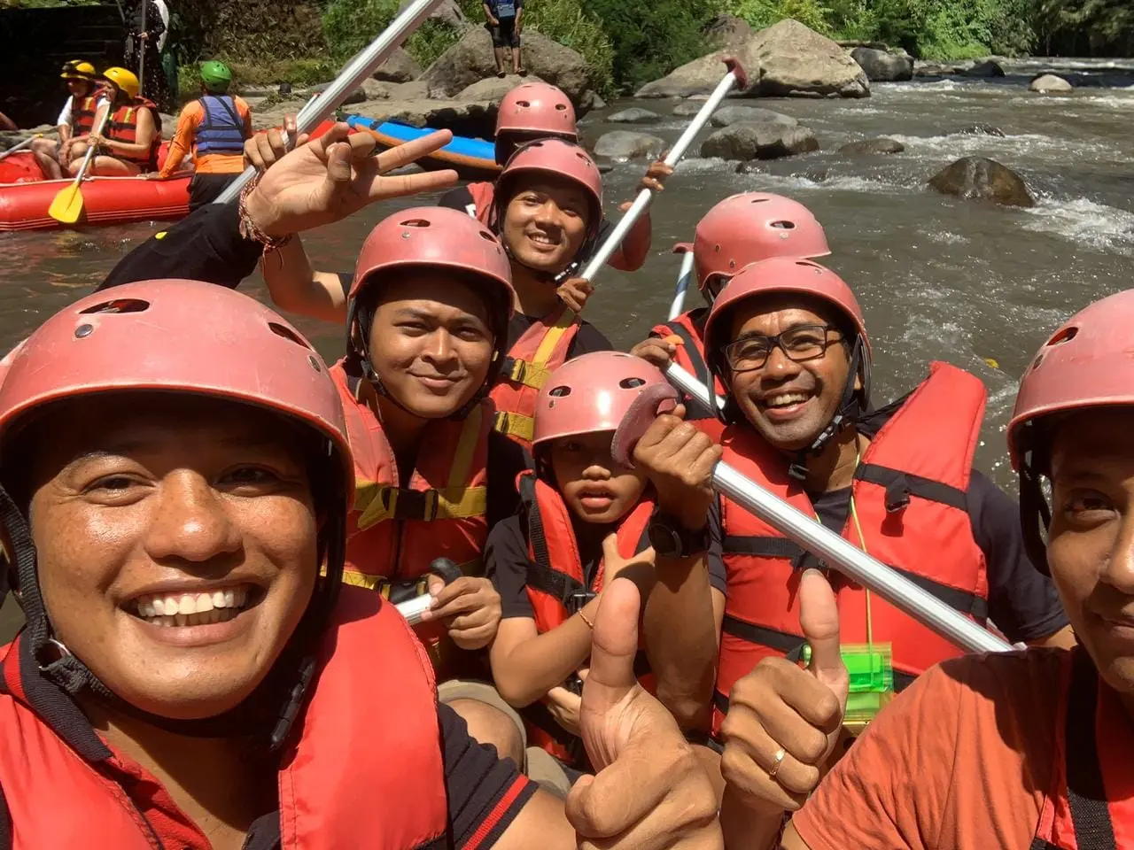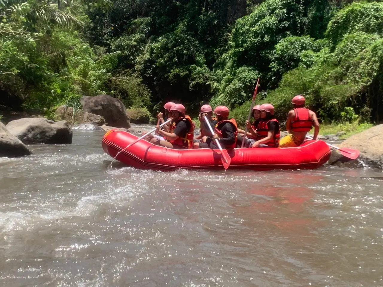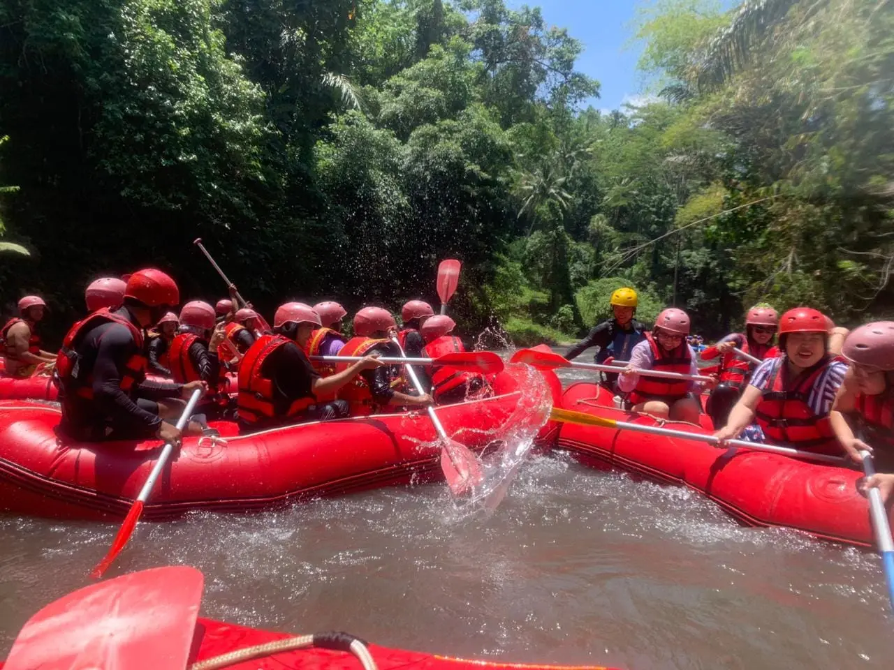The event which started at 10:00 am was filled with rafting together for 2 hours on the Ayung river, through the Bongkasa line. It seemed that all the teams were happy and there were even some people who were the first time to join in this rafting sport. Then the event continued with celebrating anniversarry, lunch together, fun games, lucky draws and suave.