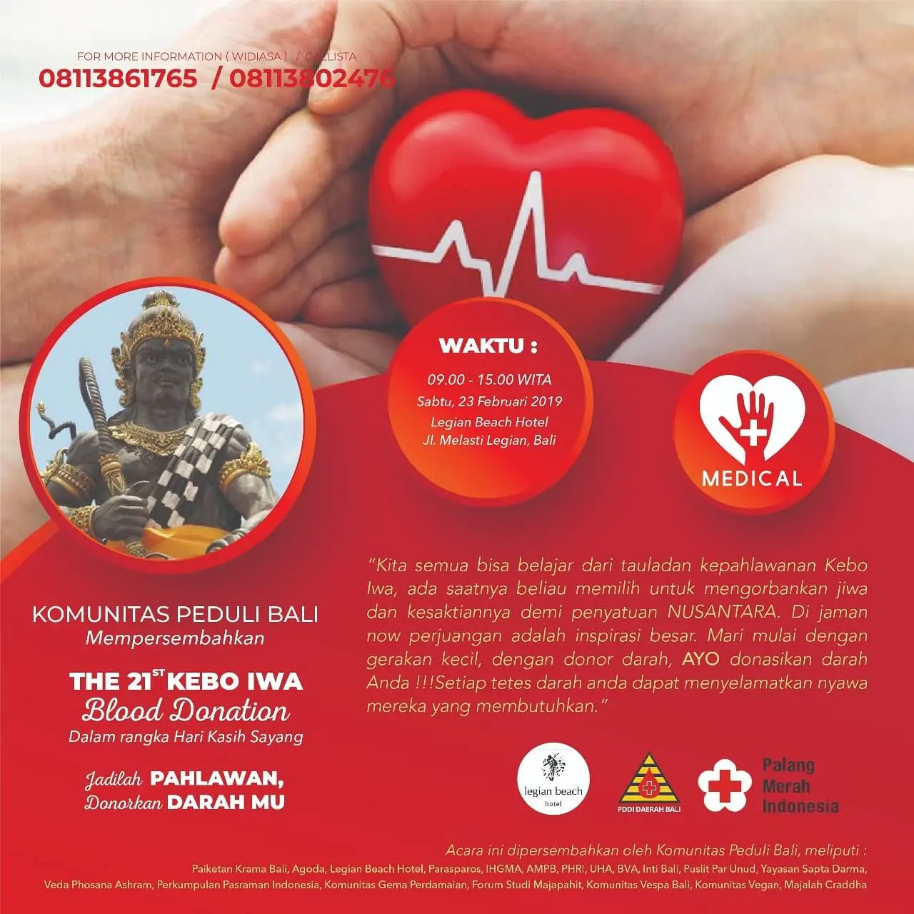Ketut Darmika, one of the Steering Committee (SC) of the blood donor activity, said that Kebo Iwa Blood Donation is a continuation of the Valentine Blood Donation event that has been held every year without stop until now, the 21st year.